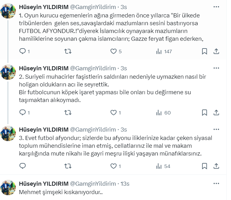 “Oyun kurucu egemenlerin ağına girmeden önce yıllarca "Bir ülkede tribünlerden gelen ses,savaşlardaki mazlumların sesini bastırıyorsa FUTBOL AFYONDUR!"diyerek İslamcılık oynayarak mazlumların hamiliklerine soyunan çakma islamcıların; Gazze feryat figan ederken, Suriyeli muhacirler faşistlerin saldırıları nedeniyle uymazken nasıl bir holigan oldukların acı ile seyrettik.Bir futbolcunun köpek işaret yapması bile onları bu değirmene su taşımaktan alıkoymadı. Evet futbol afyondur; sizlerde bu afyonu iliklerinize kadar çeken siyasal toplum mühendislerine iman etmiş, cellatlarınız ile mal ve makam karşılığında mute nikahı ile gayri meşru ilişki yaşayan münafıklarsınız.”