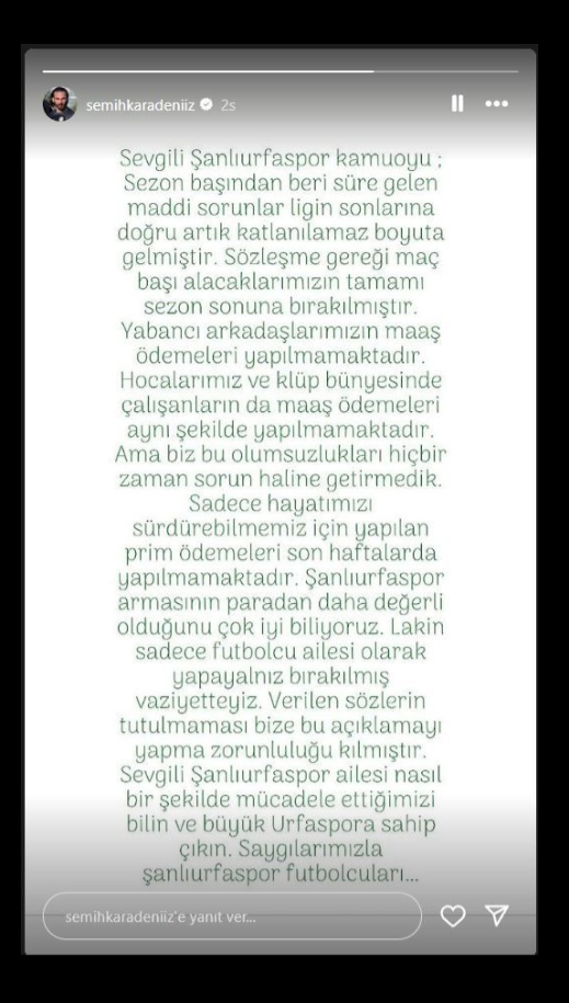 Verilen sözlerin tutulmaması bize bu açıklamayı yapma zorunluluğu kılmıştır. Sevgili Şanlıurfaspor ailesi nasıl bir şekilde mücadele ettiğimizi bilin ve büyük Urfaspor'a sahip çıkın."