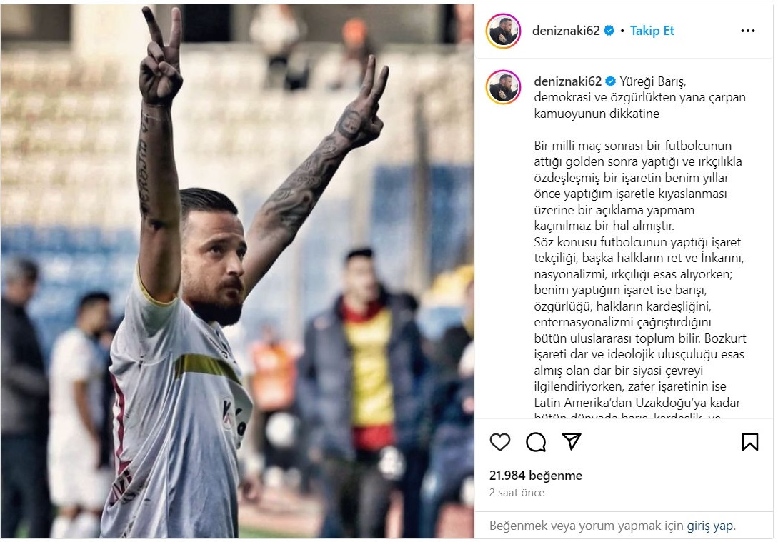 Haber Merkezi – Amedspor’da bir dönem oynayan ve Zafer işareti yaptığı için futboldan men edilen Kürt futbolcu Deniz Naki, gündemde tartışılan Merih Demiral'a ve yaptığı Bozkurt işaretine ilişkin açıklama yaptı. Naki, “İki işaretin aynı anlama geldiğini ifade etmek abesle iştigaldır. Bu fark akla kara kadar farklı dünyaları ifade etmektedir. Zafer işareti tarihin beyaz sayfasında halkların barış ve özgürlük umudu iken, Bozkurt işareti halkların boğazlaşmasını, dar ideolojik kalıpları, kan ve gözyaşı ile tarihin kara sayfasında yer edinmiştir” dedi.
