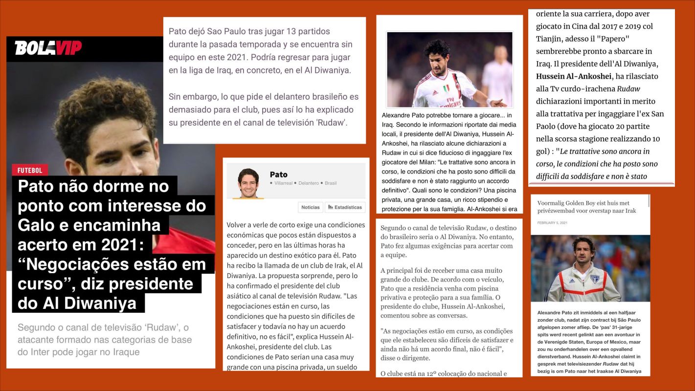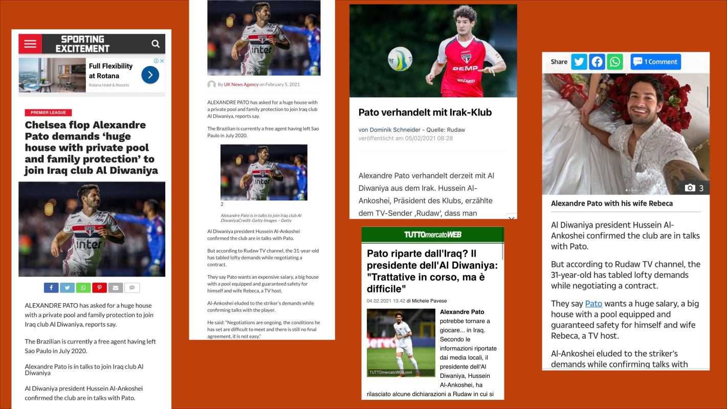 Rûdaw’ın Pato’nun transferiyle ilgili UK News, Sun gazetesi, Tutto Mercato, ESPN ve Fusbol gibi dünyanın önde gelen birçok medya kuruluşu tarafından yayınlandı.