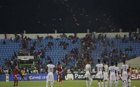 Oyuncular, tribünlerden atılan cisimlerden kaçmaya çalışırken, Gana taraftarları sahaya girip kale arkasında toplanarak korunmaya çalıştı.