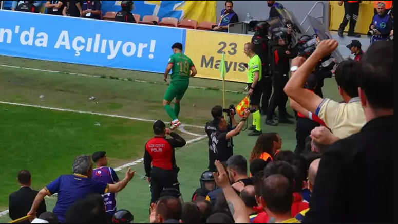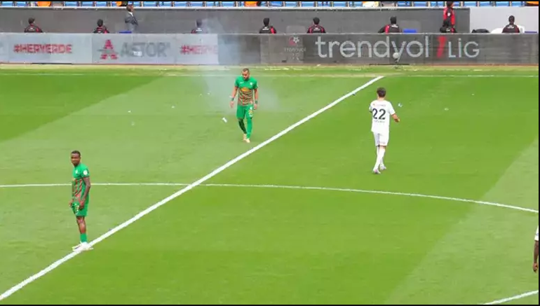 Amedspor’un 9. dakikada kullandığı köşe vuruşunda, taraftarlar korner bayrağı çevresine su şişesi fırlattı.
