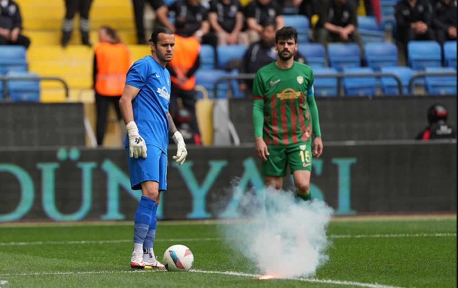 Maç öncesinde maraton ve kale arkası tribünlerinden Amedspor oyuncularına yabancı maddeler atıldı.