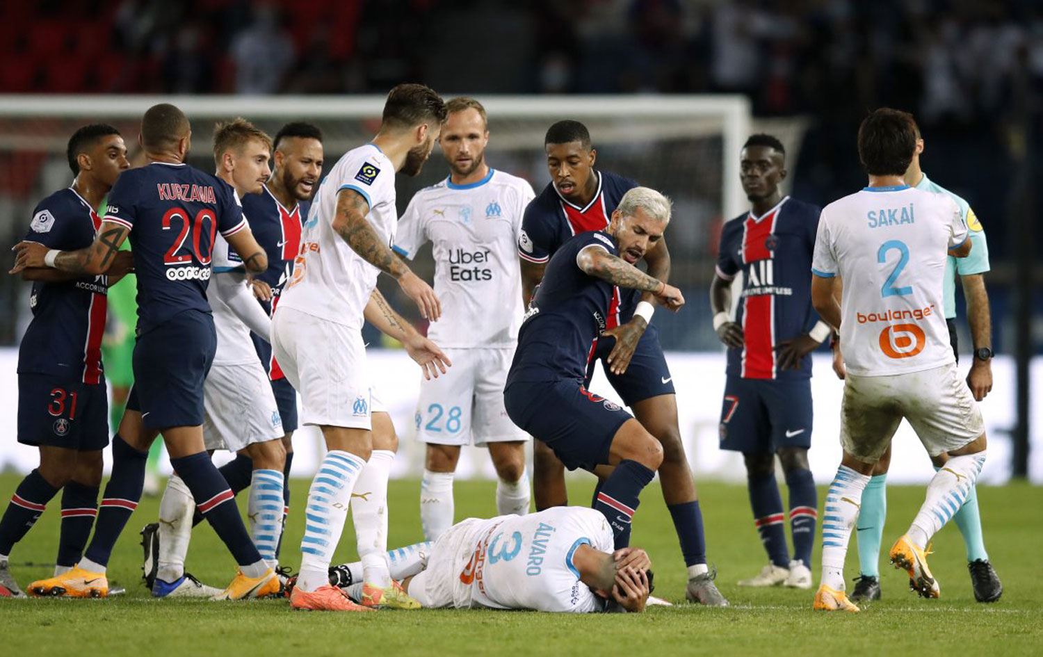 Karşılaşmanın uzatma dakikalarında iki takım oyuncuları arasında yaşanan gerginlik sonucu PSG'den Neymar, Leandro Paredes ve Layvin Kurzawa, Olympique Marsilya'dan ise Jordan Amavi ve Dario Benedetto kırmızı kart gördü.