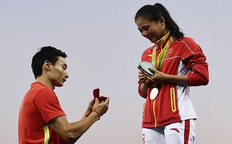 Erkekler 3 metre tramplen atlamada bronz madalya kazanan 30 yaşındaki erkek arkadaşı Qin Kai, tören sırasında He Zi'nin yanına gelip diz çöktü ve yüzlerce seyirci karşısında evlilik teklif etti.