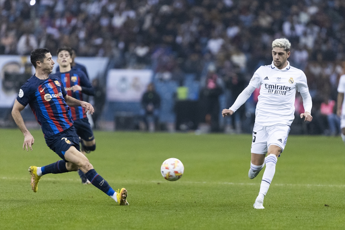 Suudi Arabistan'ın başkenti Riyad'daki Kral Fahd Stadyumu'nda oynanan karşılaşmanın ilk yarısını Barcelona, 33. dakikada Gavi ve 45. dakikada Robert Lewandowski'nin golleriyle 2-0 önde kapattı.