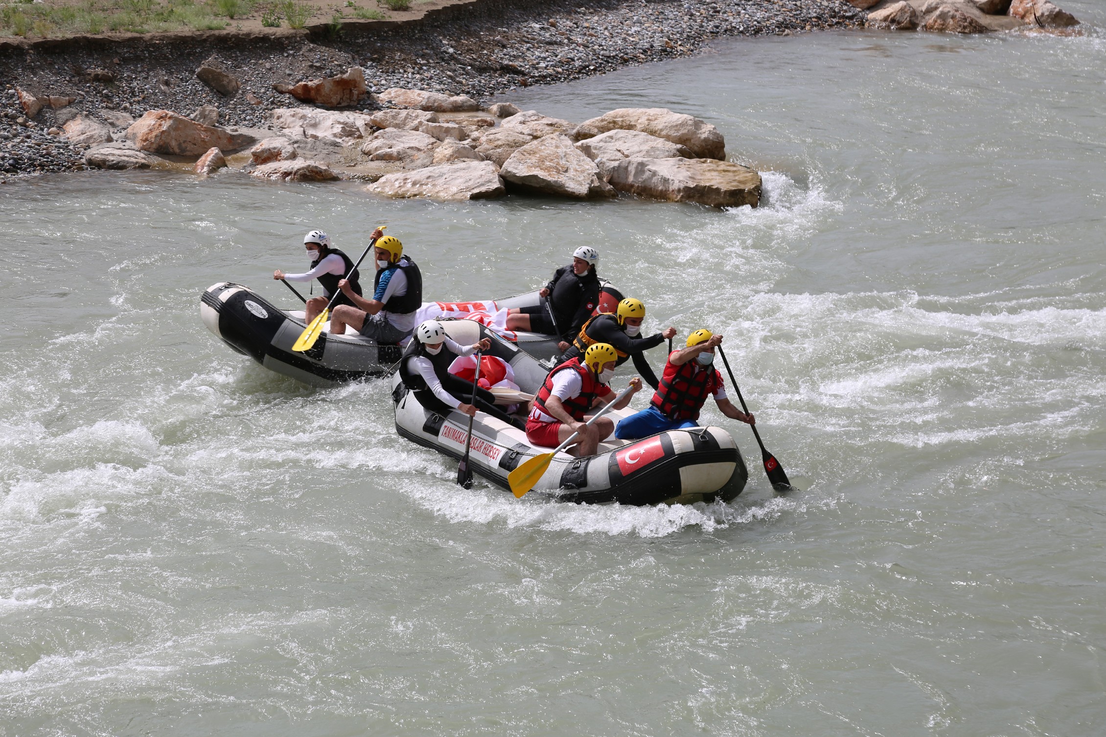 Yeni tip koronavirüs (Covid-19) tedbirleri kapsamında rafting botlarına 4'erli sporcu grupları bindi. Yaklaşık bir saat süren rafting kent merkezinde Mavi Köprü mevkiinde sona erdi..