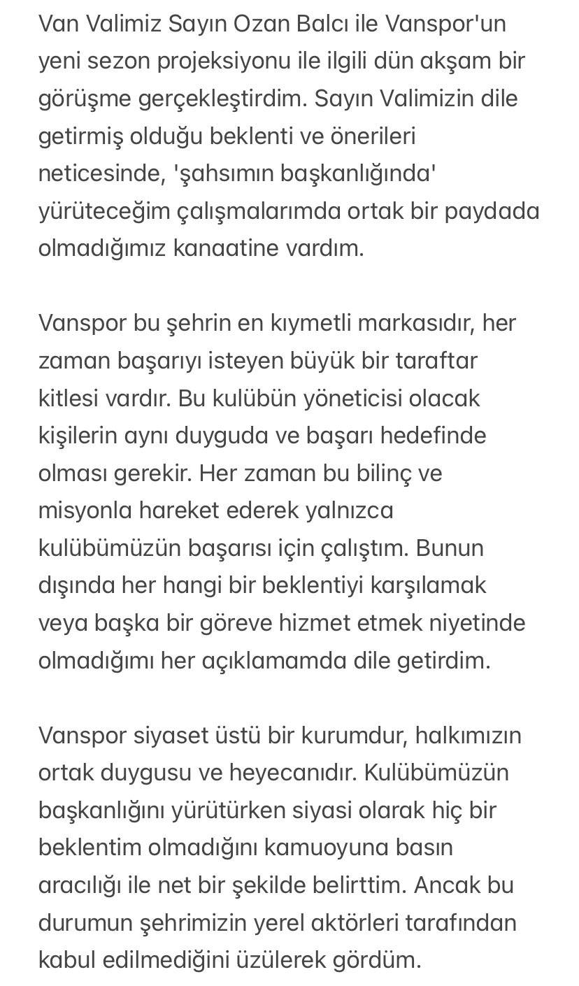 Vanspor Başkanı Mehmet Avcı, Twitter hesabı üzerinden yaptığı açıklama ile görevi bıraktığını duyurdu.