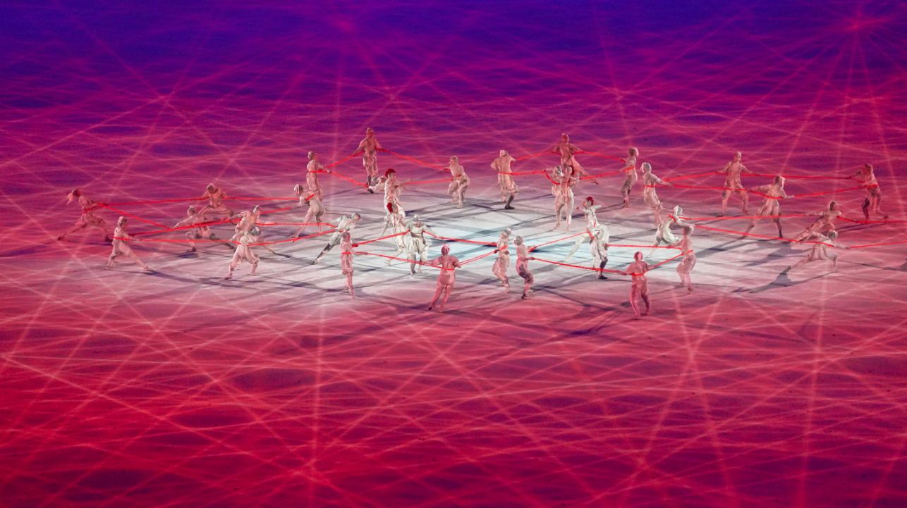 Covid-19'dan dolayı sporcuların bir araya gelememesine vurgu yapılan dans gösterisinde "Ayrıyız ama yalnız değiliz" teması işlendi.