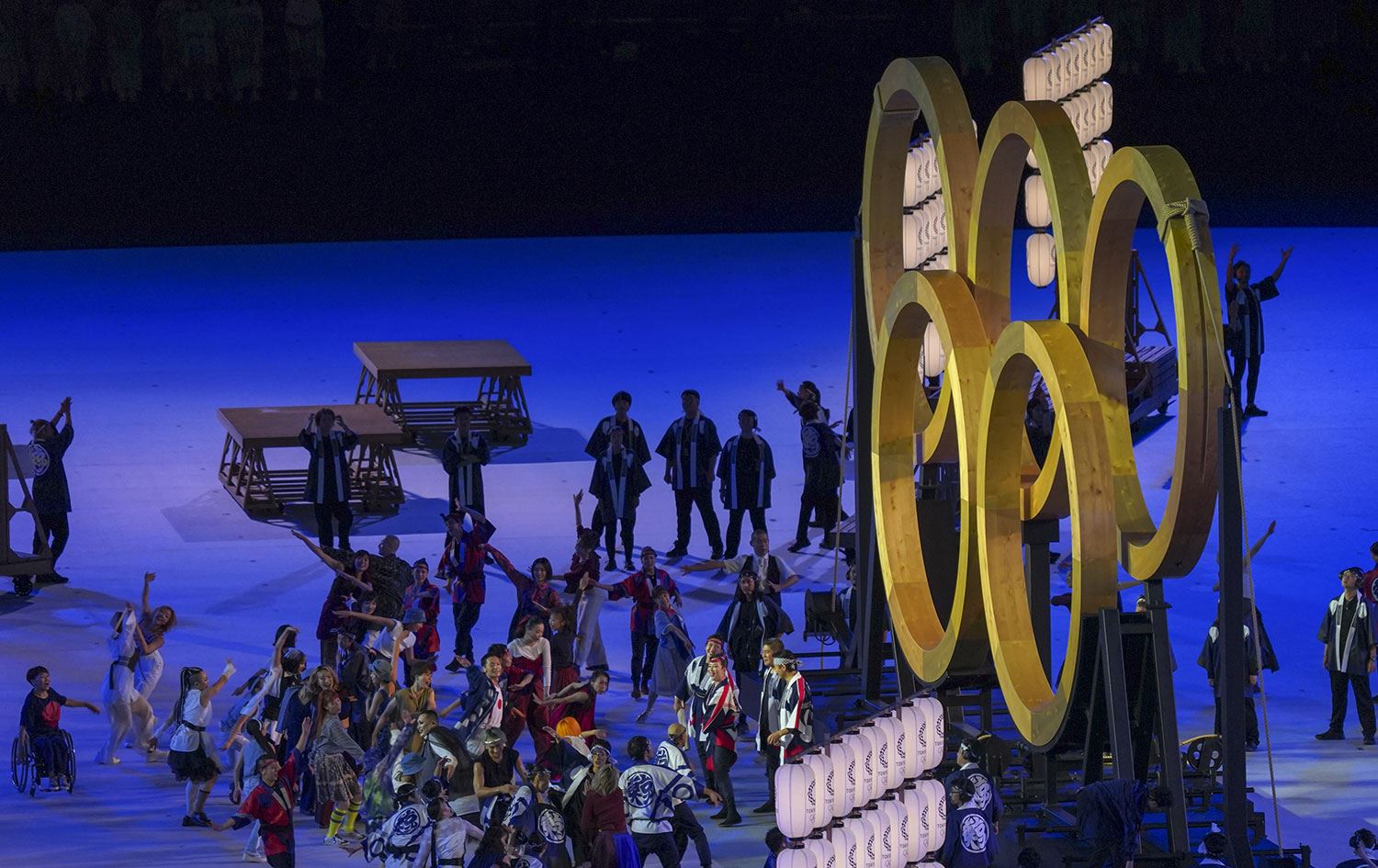 Pandemiye rağmen oyunların yapılmasına göndermede bulunan gösteride dansçılar; koşu bandı, kondisyon bisikleti ve kürek çekerek "Her şeye rağmen sporcunun spora dönmesi" sembolize edildi. Stat çatısında patlatılan havai fişekler törene renk kattı.