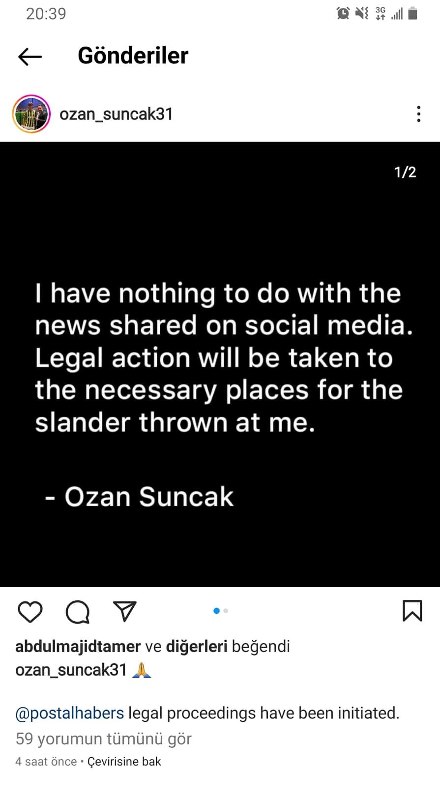 "Oyuncumuz Ozan Suncak ile ilgili sosyal medyuada paylaşılan asılsız iddialar ile ilgili hukuki yönden hakkımızı arayacağımızı bildirmek istiyoruz. Geleceği çok parlak büyük bir yeteneği yalan haberler ile lekelemek en kibar deyimle son derece aşağılık bir tutumdur. Ozan Sucak’ın siyasetle uzaktan veya yakından alakası yoktur. Söz konusu paylaşım Ozan Suncak'a ait değildir. Paylaşımı yapan ve çoğaltan kişiler karşısında oyuncumuzun hakkını hukuk önünde arayacağız."