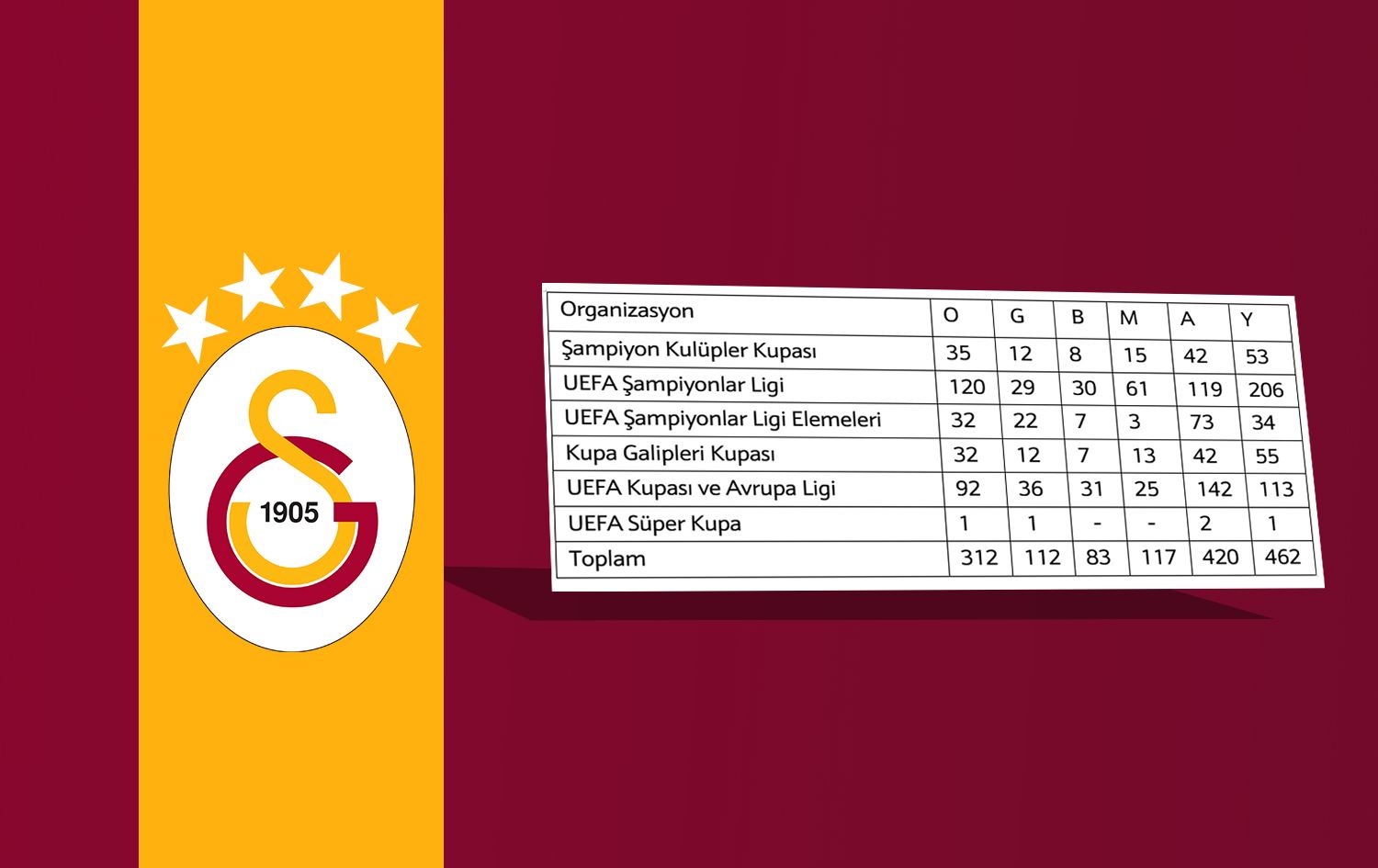 Sarı-kırmızılı takım, Avrupa kupalarında çıktığı 312 müsabakanın 112'sinden galibiyetle ayrıldı. 117 karşılaşmada rakiplerine mağlup olan Galatasaray, 83 mücadeleyi ise beraberlikle tamamladı.