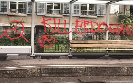 Haber Merkezi- İsviçre’de Türkiye’nin Zürih Başkonsolosluğu önünde yüzleri kar maskeli kişiler, konsolosluğa boyalarla saldırıp, otobüs durağına da kırmızı boyalarla "Kill Erdogan (Erdoğan'ı öldürün)" yazdı.