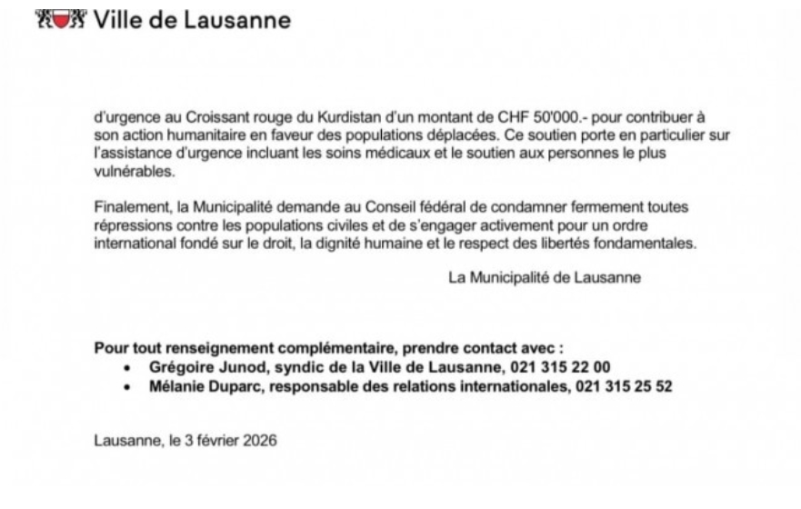 Lozan Belediyesi Basın Bürosu’nun yayınladığı bildiride Rojava’daki göçmenler için Kürt Kızılayı’na 50 bin İsviçre frangı (yaklaşık 2 milyon 800 bin Türk lirası) bağış yapıldığı bildirildi.
