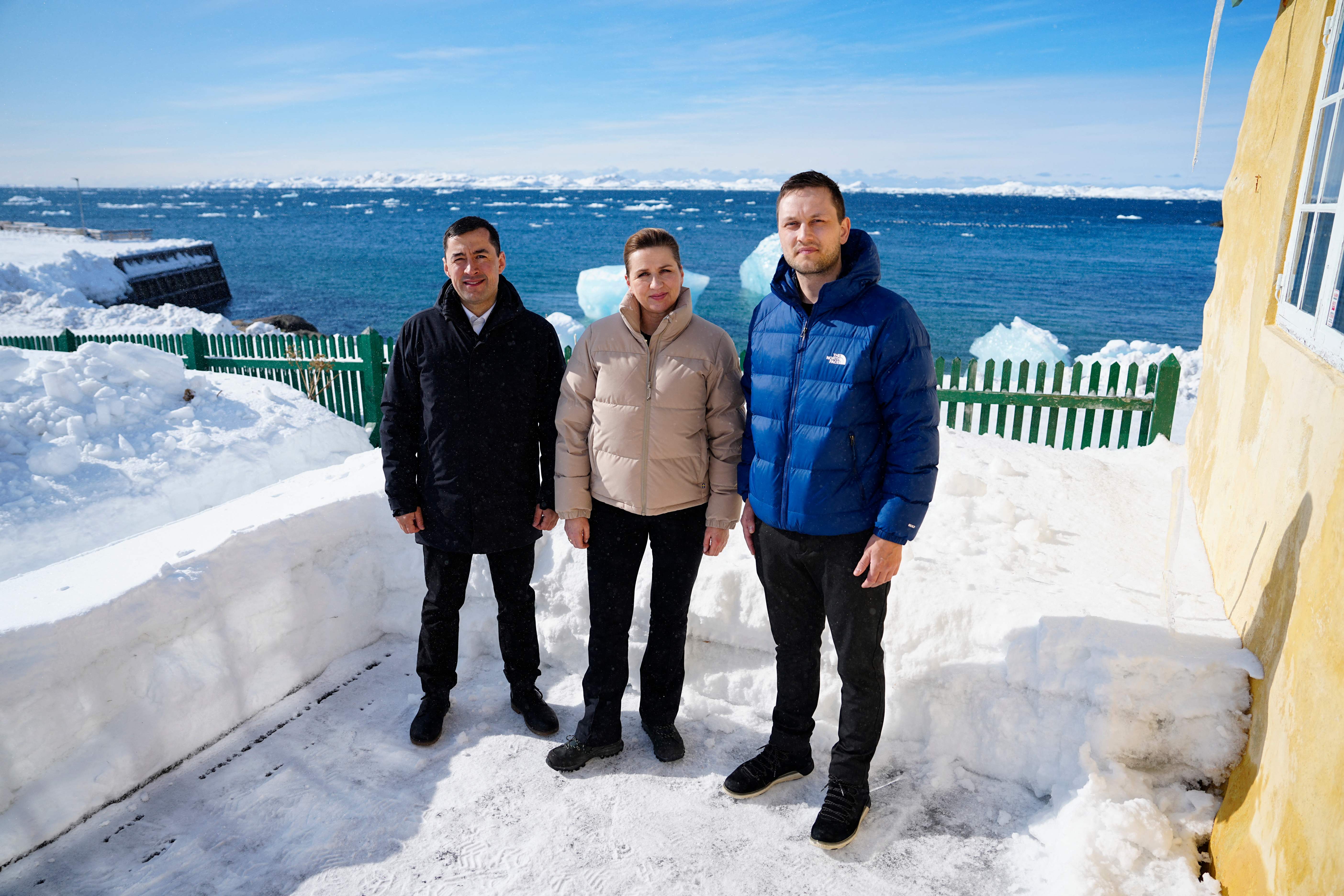 Danimarka Başbakanı Mette Frederiksen (ortada), 2 Nisan 2025'te Grönland'ın geçici Hükümet Başkanı Mute Bourup Egede (solda) ve yeni seçilen hükümet başkanı Jens-Frederik Nielsen ile Nuuk, Grönland'da bir araya geldi. / Fotoğraf: Mads Claus Rasmussen / Rıtzau Scanpıx / AFP