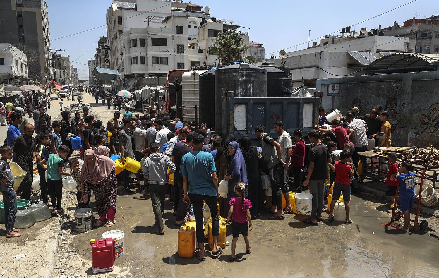 Gazze Şehri'nde yerinden edilmiş insanlar, tankerlerle getirilen suyu bidonlara dolduruyor. / AA