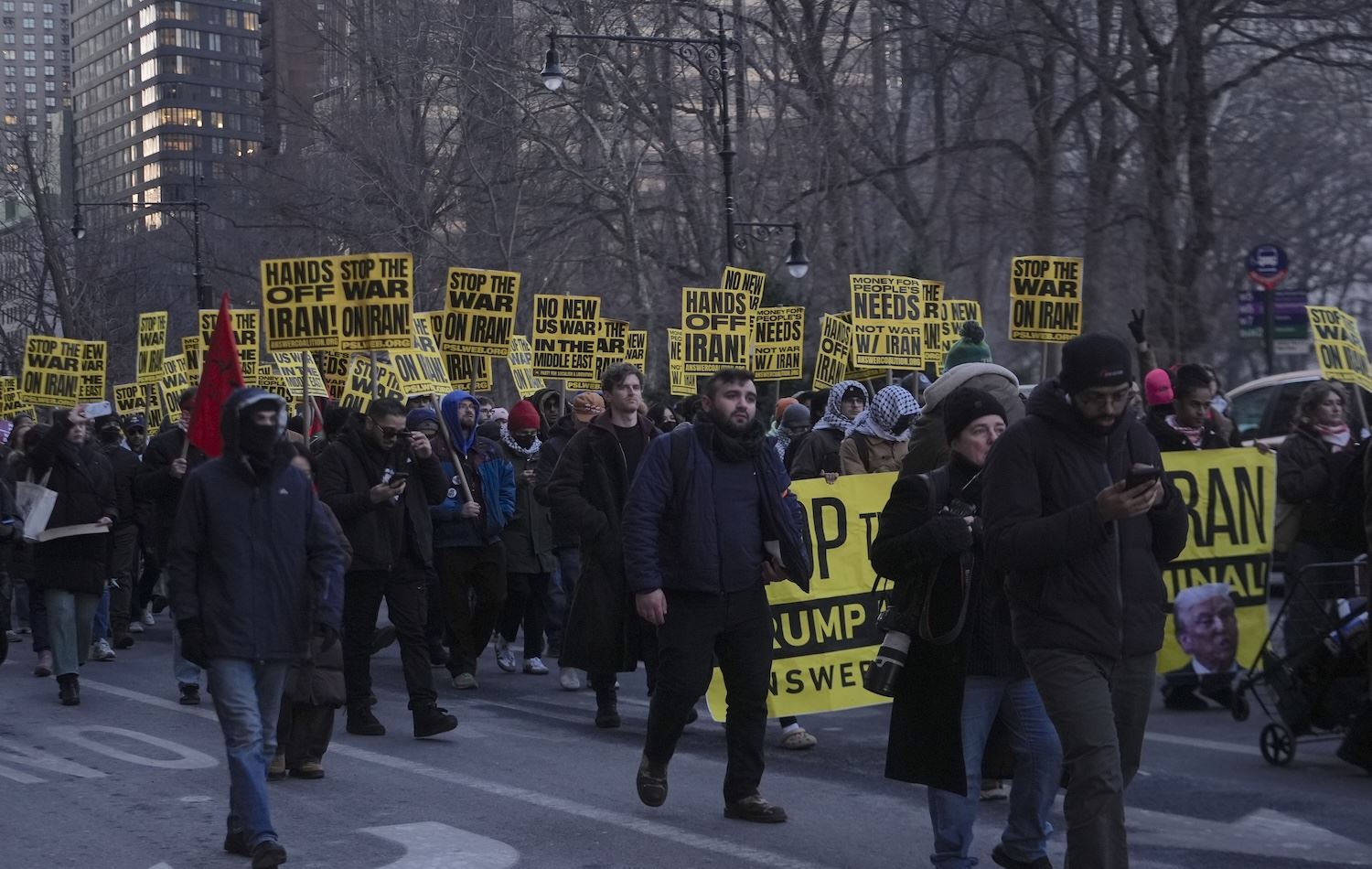 Columbus Circle’da toplanan göstericiler daha sonra Trump Tower’a yürüdü. Protestocular saldırıların sona erdirilmesini ve ABD’nin çatışmaya dahil olmamasını talep eden pankartlar taşıdı.