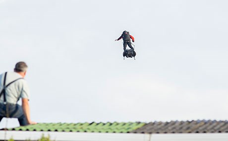 Yaklaşık 35 kilometrelik uçuşu sırasında, kaykayına yakıt ikmali yapan Zapata, yakıtını sırtında taşıyor.