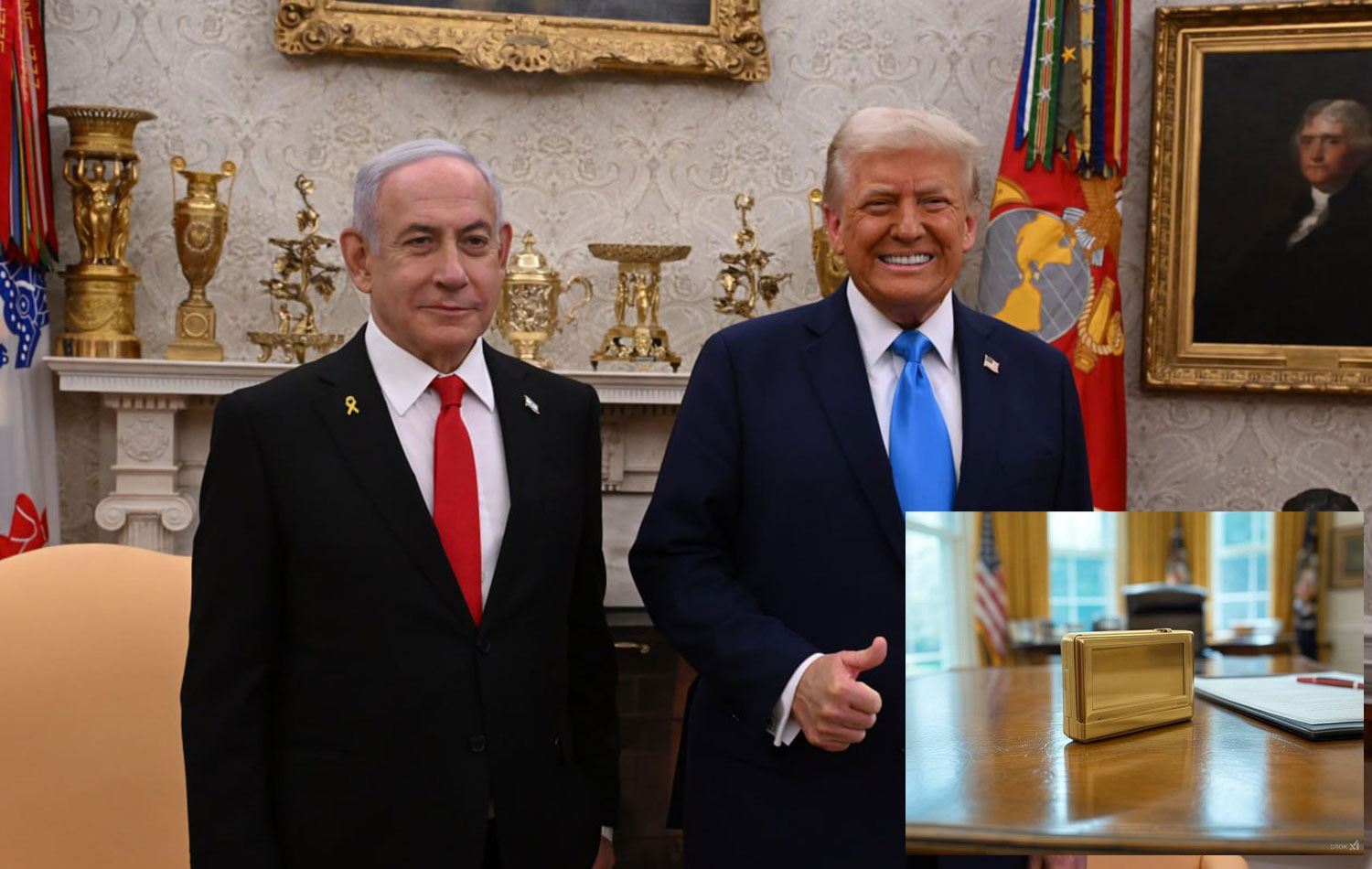 Beyaz Saray'da ABD Başkanı Donald Trump'la bir araya gelen İsrail Başbakanı Netanyahu, Trump’a altın kaplama bir çağrı cihazı hediye etti.