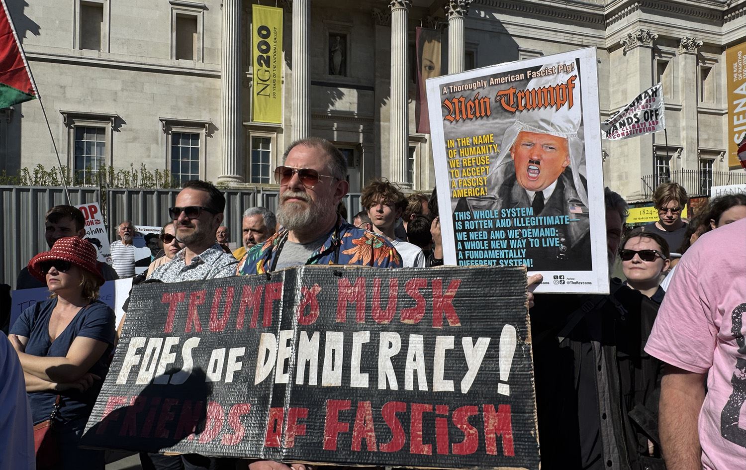 Protestocular, taşıdıkları "Trump-Musk demokrasinin düşmanı, faşistlerin dostu", "Demokrasiyi savun, Trump ve Musk'ı durdur", "NATO, Grönland, Panama, Ukrayna, Kanada ve Gazze'den elini çek" pankartları taşıdı.