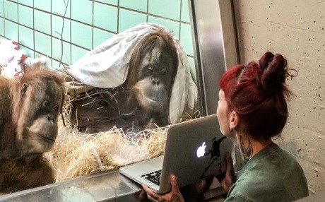 Hayvanat bahçesi çalışanları Sinta ve Conny adlı iki dişi orangutana, bekar erkek orangutanların videoları gösterildi.