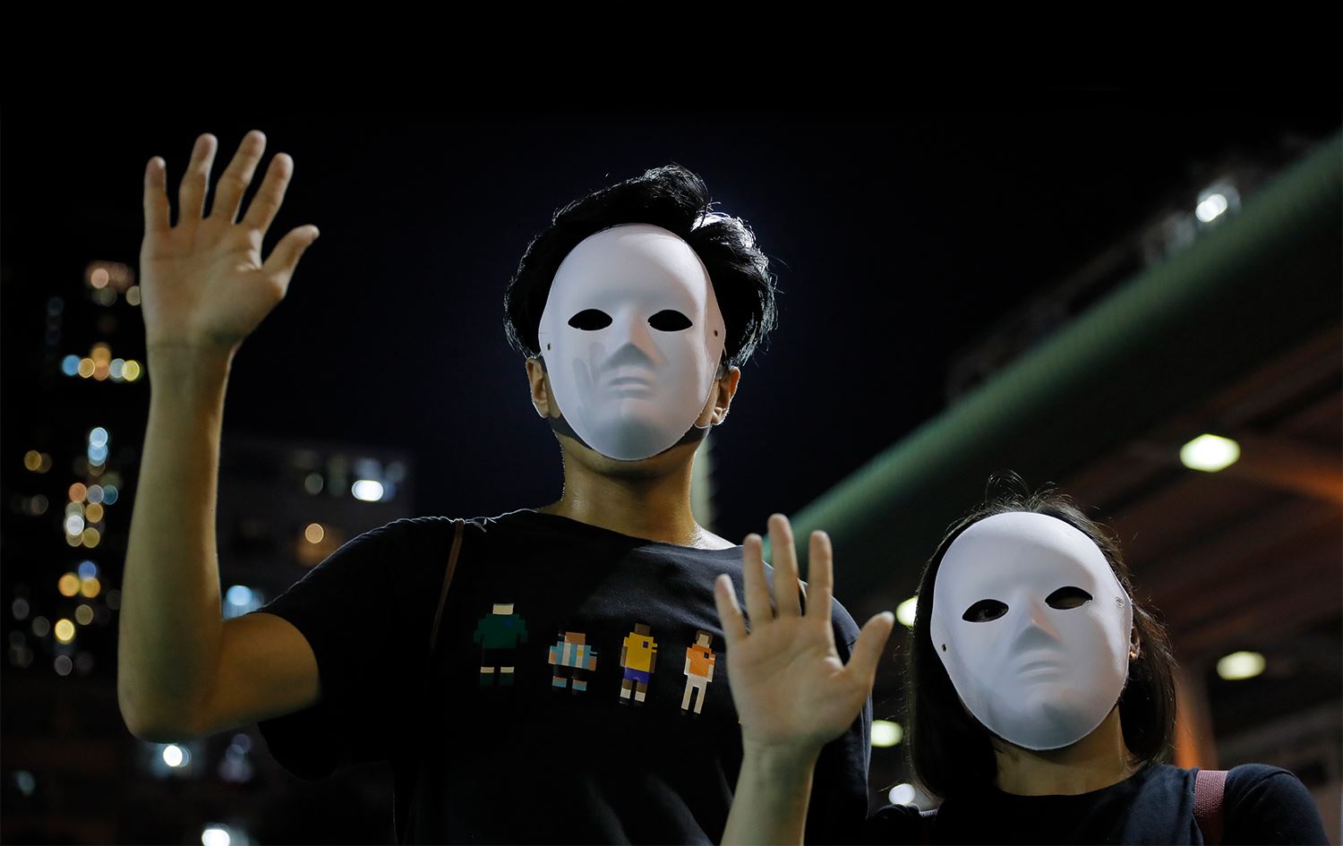 Yağışlı havaya rağmen Hong Kong'un sokaklarını dolduran çoğunluğu maskeli on binlerce kişi, "Maske giymek suç değildir." sloganları eşliğinde yürüdü.