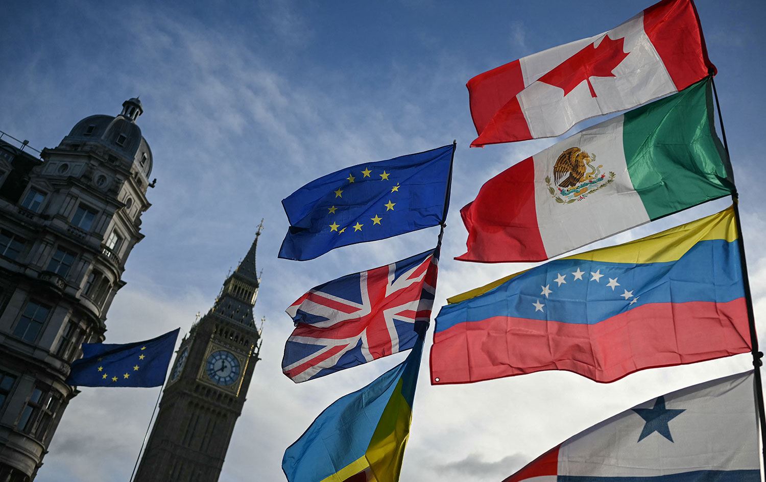 7 Ocak 2026'da Londra'daki parlamento binası önünde Trump karşıtı protestocular tarafından sergilenen bayraklar. / Fotoğraf: JUSTIN TALLIS / AFP