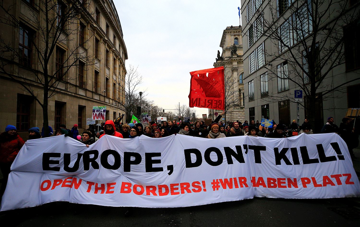 Üzerinde “Avrupa öldürme, sınırlarını aç” yazan pankart açan göstericiler, “Avrupa harekete geç”, “Yazıklar olsun AB”, “İnsanlığın sınırı yok” yazılı dövizler taşıdı ve “Sınırları açın” şeklinde slogan attı.