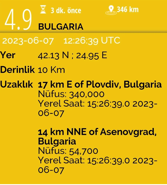 Afet ve Acil Durum Yönetimi Başkanlığı (AFAD) ise Bulgaristan'daki depremin büyüklüğünü 4.7 olarak açıkladı.
