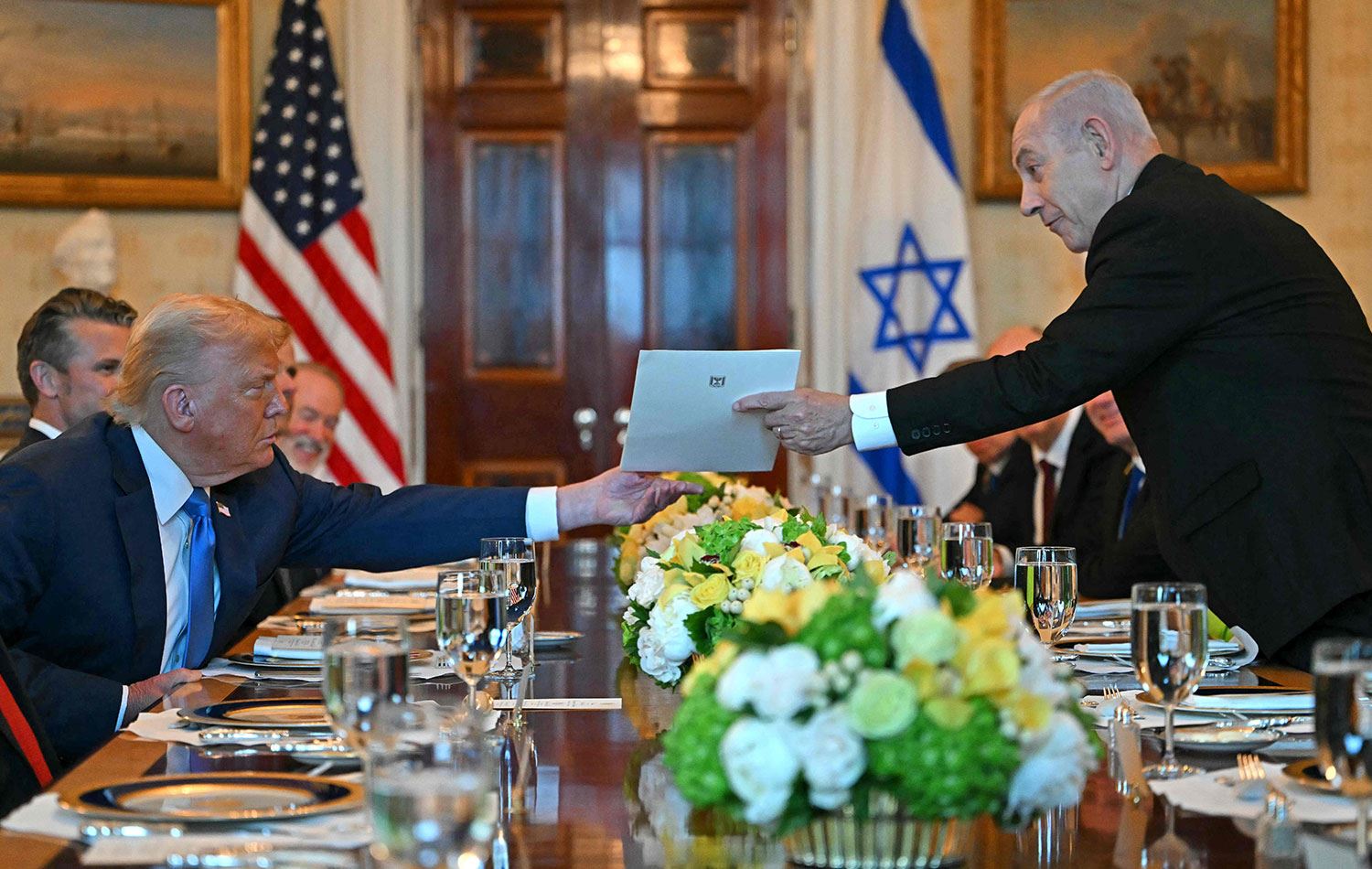 Netanyahu, Trump'ı Nobel Barış Ödülü'ne aday gösterdiğini söyleyerek adaylık mektubunu Trump'a teslim etti. / AFP