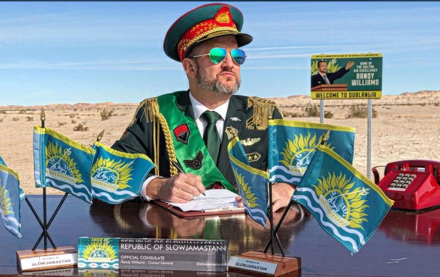 Bölgeye gidenleri devasa bir "Slowjamastan'a Hoş Geldiniz" tabelası karşılıyor. Haberde Williams'ın araziye sınır kontrol karakolu inşa ettiği ve ofisinde Slowjamastan bayrağının dalgalandığı yazıldı.