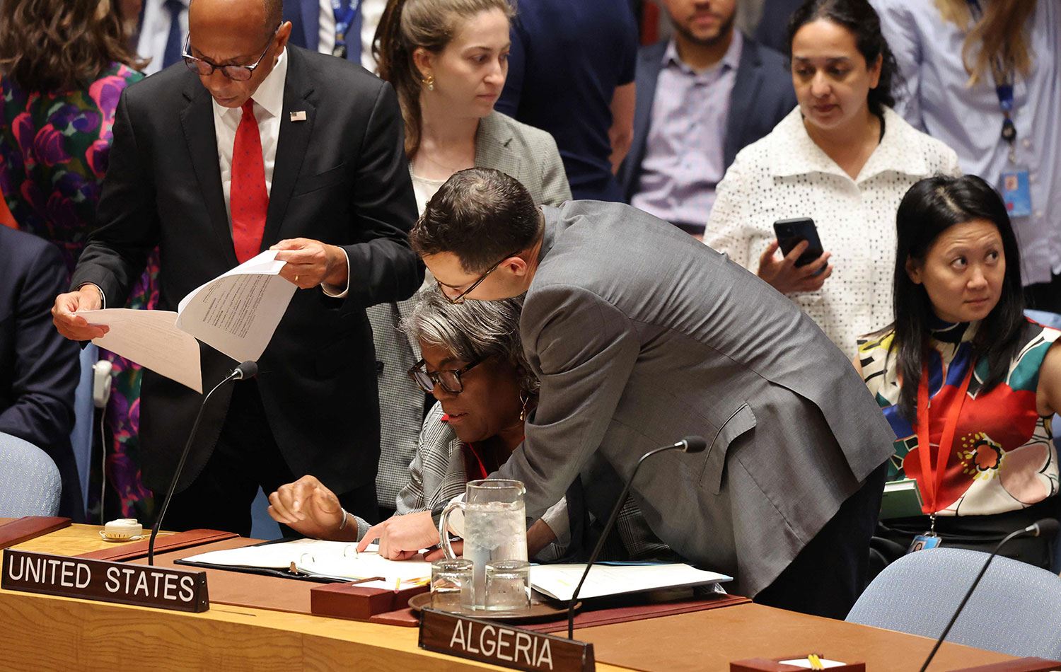 ABD'nin BM Temsilcisi Linda Thomas-Greenfield, BM Güvenlik Konseyi toplantısının başlamasından önce, Özel Siyasi İşler Alternatif Temsilcisi Büyükelçi Robert Wood ile konuşuyor. / AFP