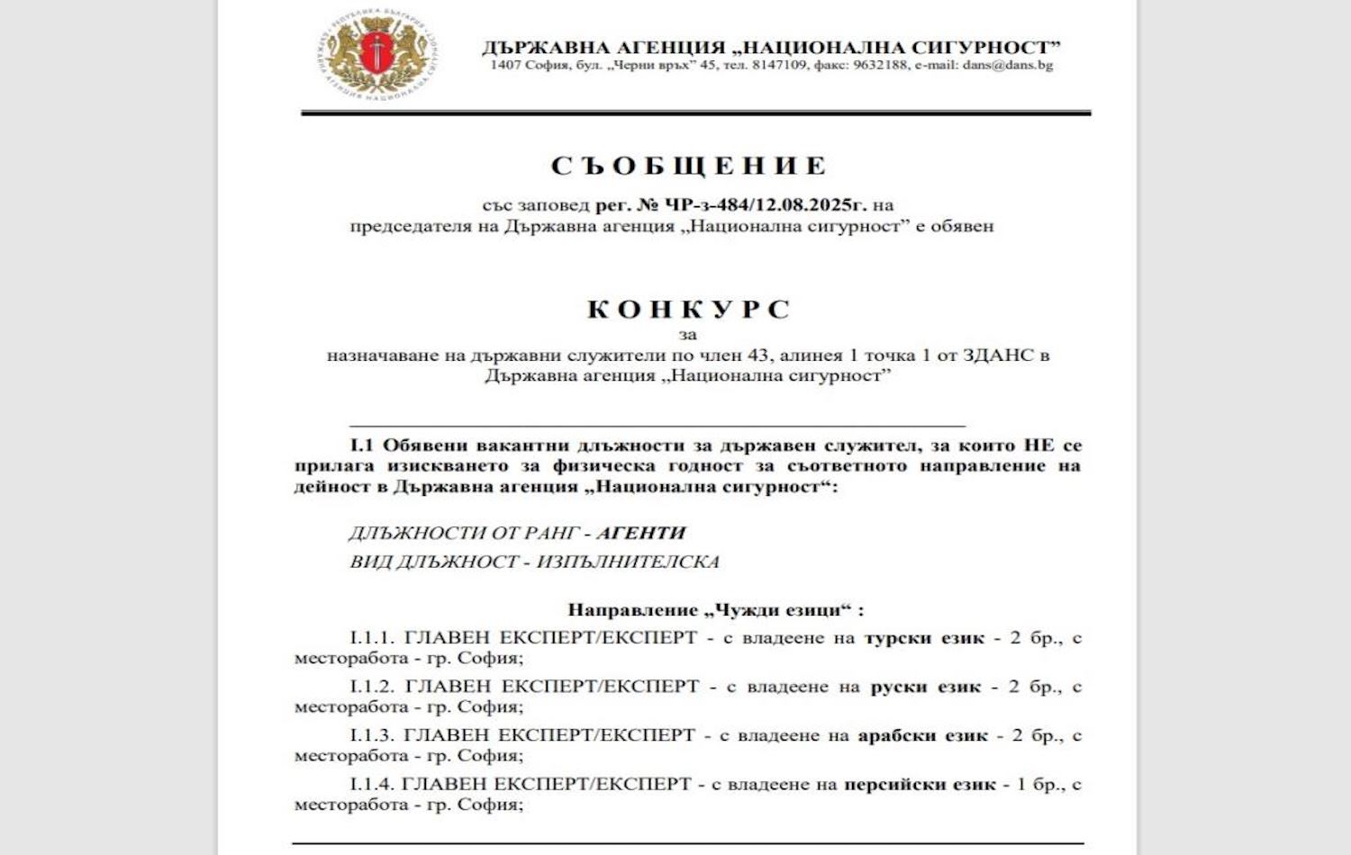 Haber Merkezi - Bulgaristan Devlet Ulusal Güvenlik Ajansı (DANS), yeni personel alımında Türkçe, Farsça ve Arapça bilen adayları öncelikli olarak değerlendireceğini açıkladı.