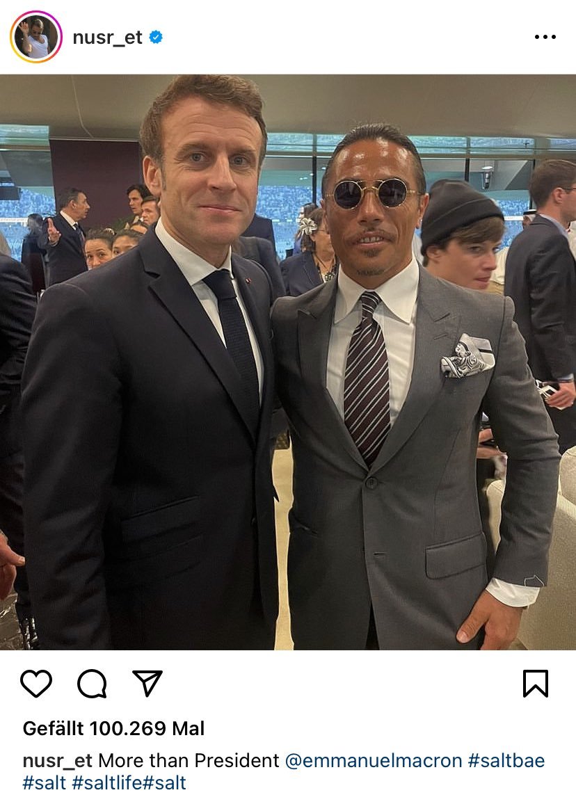 ‘Salt bae’ adlı hareketiyle dünya çapında ün kazanan şef Nusret Gökçe, Fransa Devlet Başkanı Emmanuel Macron ile çektiği fotoğrafını sosyal medyadan paylaştı.