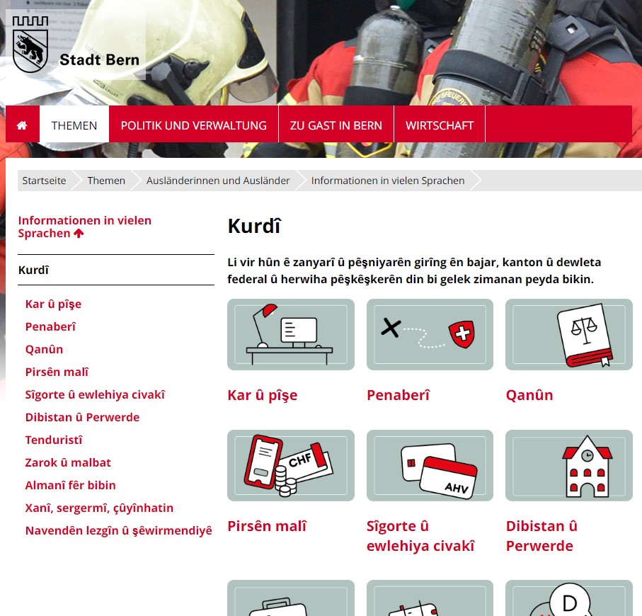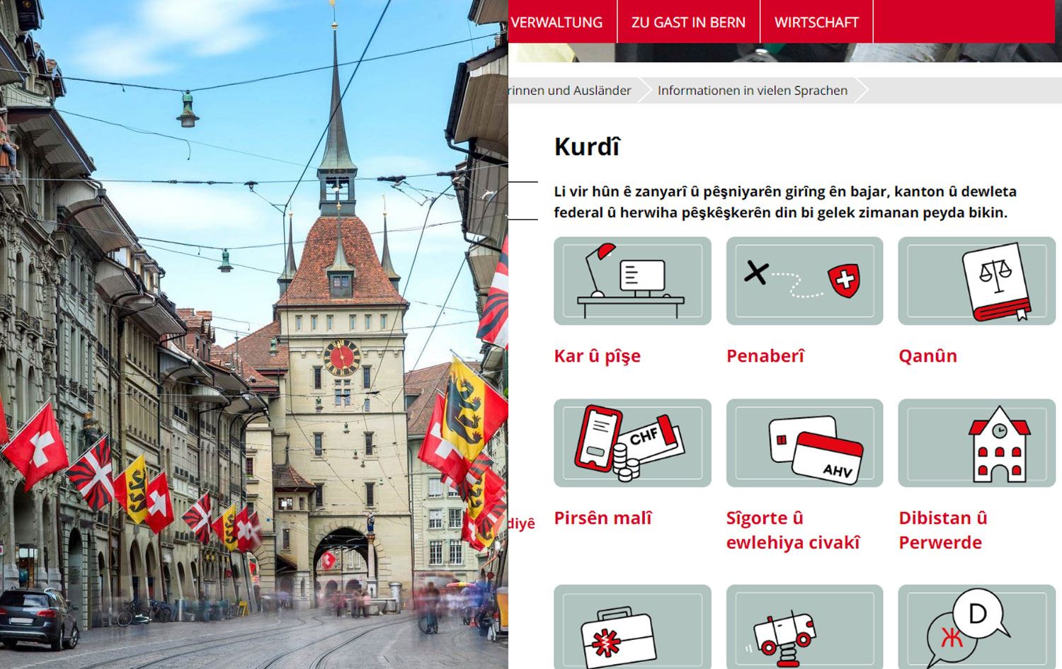 Erbil (Rûdaw) – İsviçre’nin başkenti Bern, yenilediği sitesinde 3 yeni dil seçeneğini yenileyerek Kürtçeye de yer verdi. Sitede Kürtçe dışında Rusça ve Ukraynaca dili de seçenek olarak sunuldu.