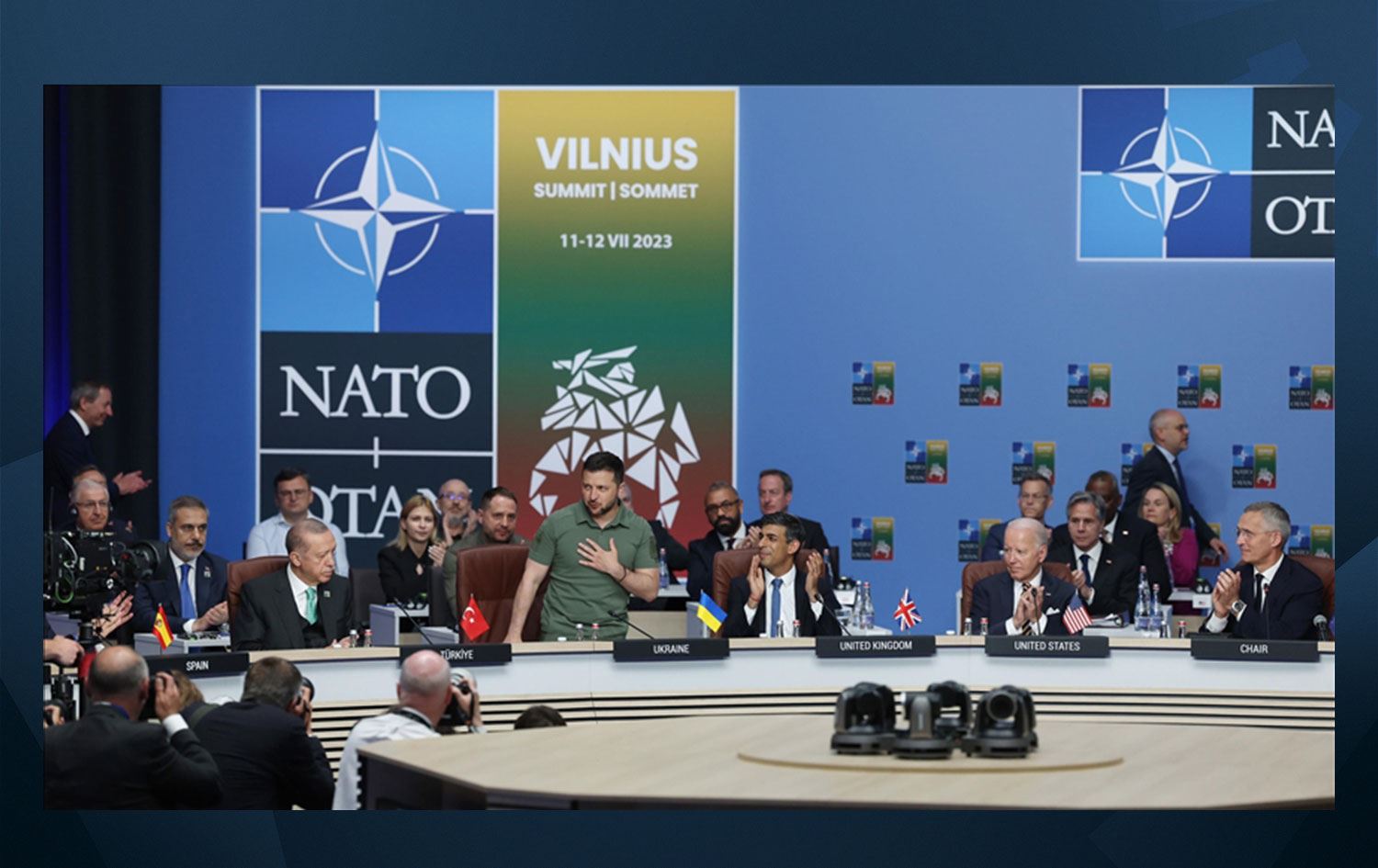 NATO liderleri tarafından alkışlarla karşılanan Zelenskiy, ülkelerin isim sıralamasına göre hazırlanan oturma düzeninde Cumhurbaşkanı Erdoğan ile İngiltere Başbakanı Rishi Sunak'ın arasında oturdu.