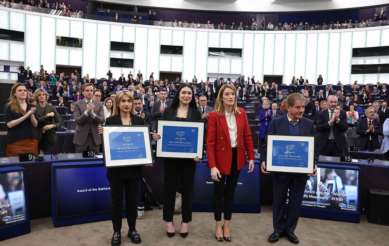 Jina Emini'nin annesi, babası ve erkek kardeşi, İranlı yetkililerin pasaportlarına el koyması ve AB'nin Sakharov Ödülü'nü almak üzere uçmalarını yasaklaması nedeniyle Fransa'nın Strazburg kentindeki törene katılamadı.