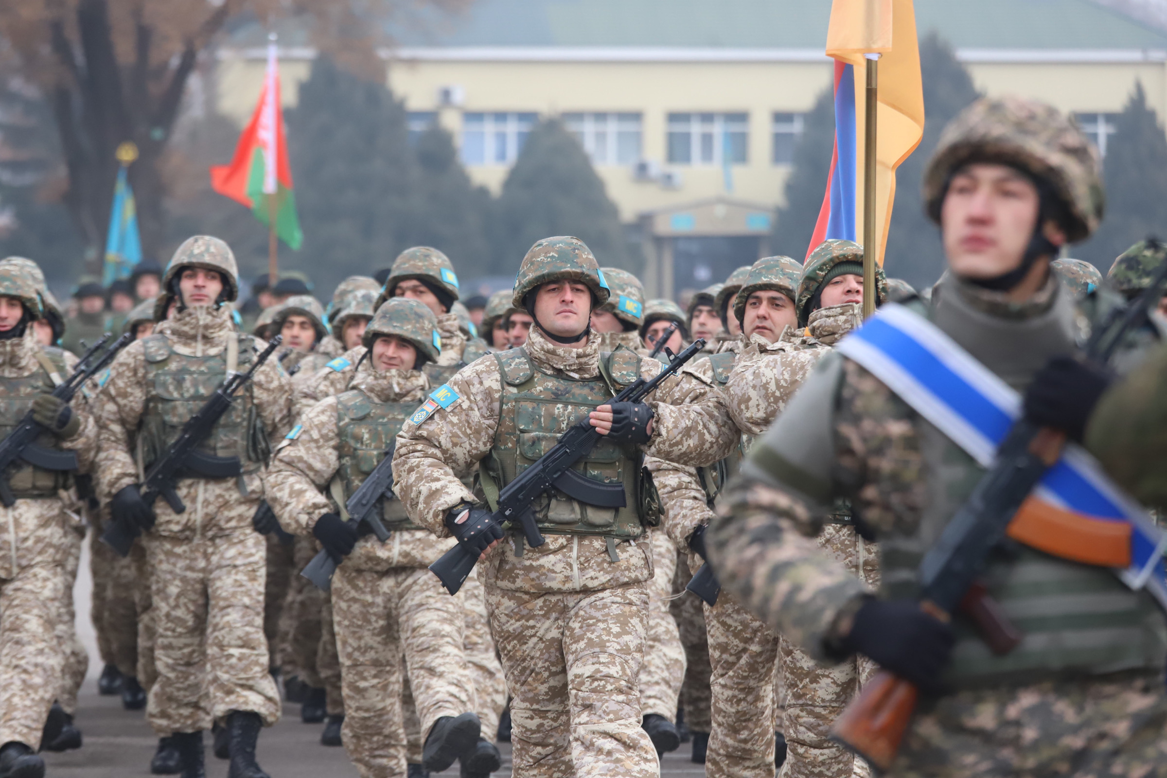 Almatı’daki Sagadat Nurmagambetov Kara Kuvvetleri Askeri Üniversitesinde Rusya, Belarus, Ermenistan, Kırgızistan ve Tacikistan’ın askeri birliklerinden oluşan KGAÖ barış gücünü ülkelerine uğurlama töreni düzenlendi.