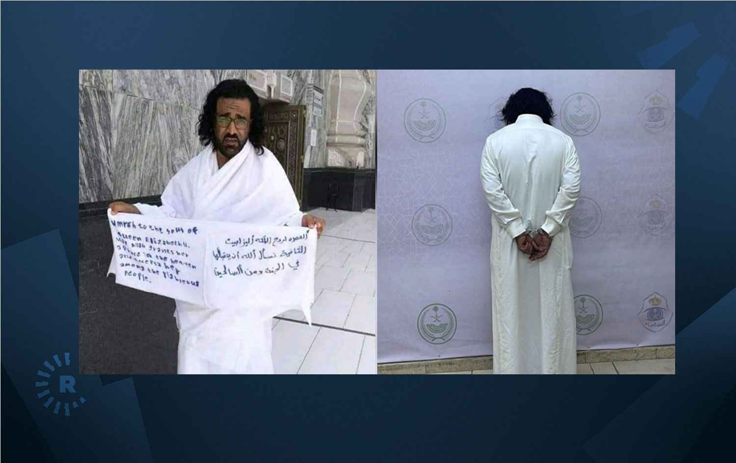 Suudi Arabistan İçişleri Bakanlığına bağlı Genel Güvenlik Müdürlüğünün Twitter hesabından yapılan yazılı açıklamaya göre, Kabe'de ihram giymiş bir Yemenli, umre yönetmeliğine ve İslam'ın ilkelerine aykırı ifadelerin yazılı olduğu bir pankart açtı.