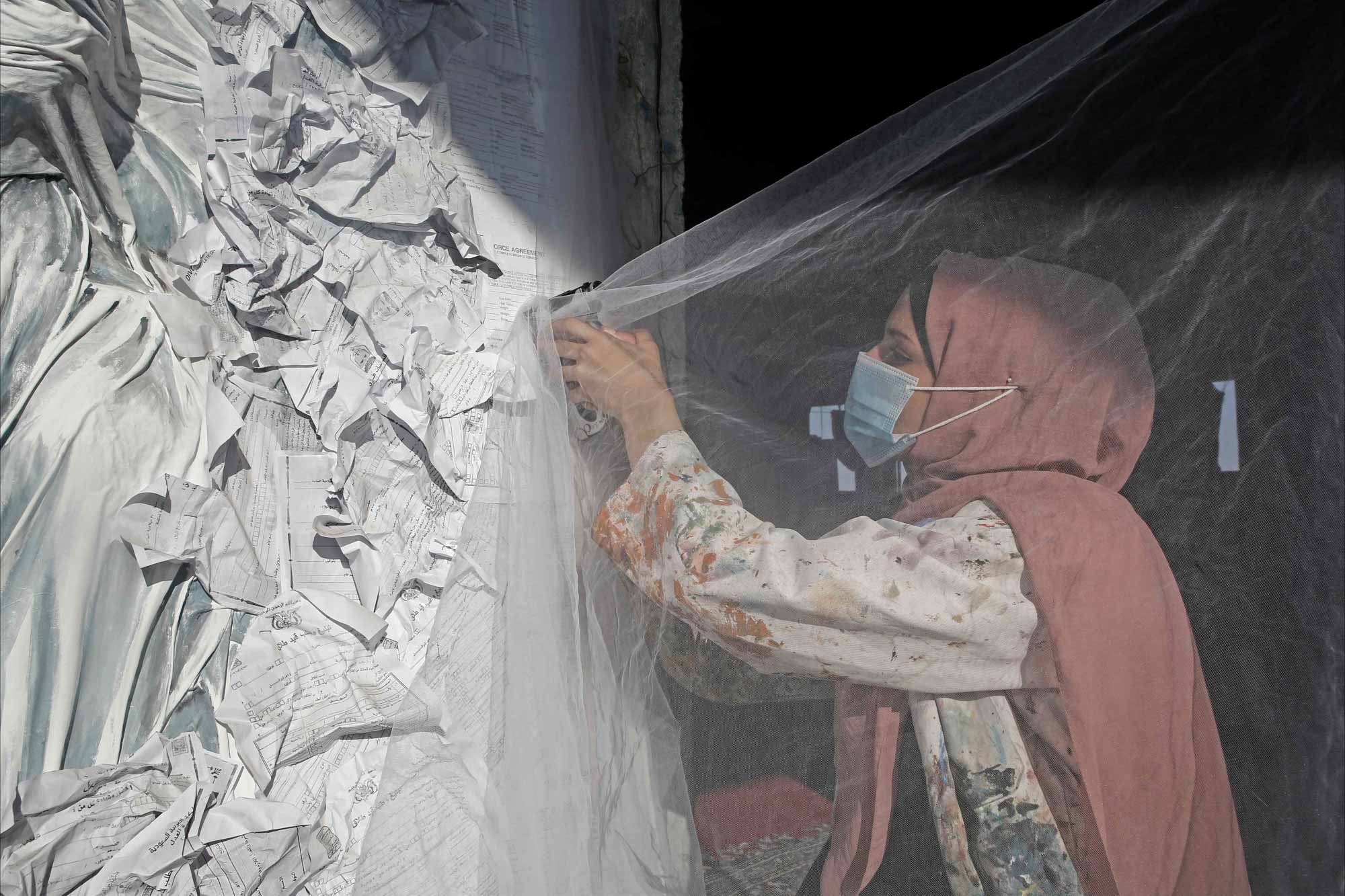 AFP – Filistinli resim sanatçısı Hulud Desuki, suluboya tablolarını kurumaları için asıyor.