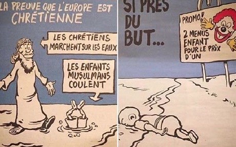 Bir diğer karikatürde, Alan'ın yarı suya gömülmüş cansız bedeni “Avrupa’nın Hristiyan olduğunun kanıtı” ifadesiyle çizildi.