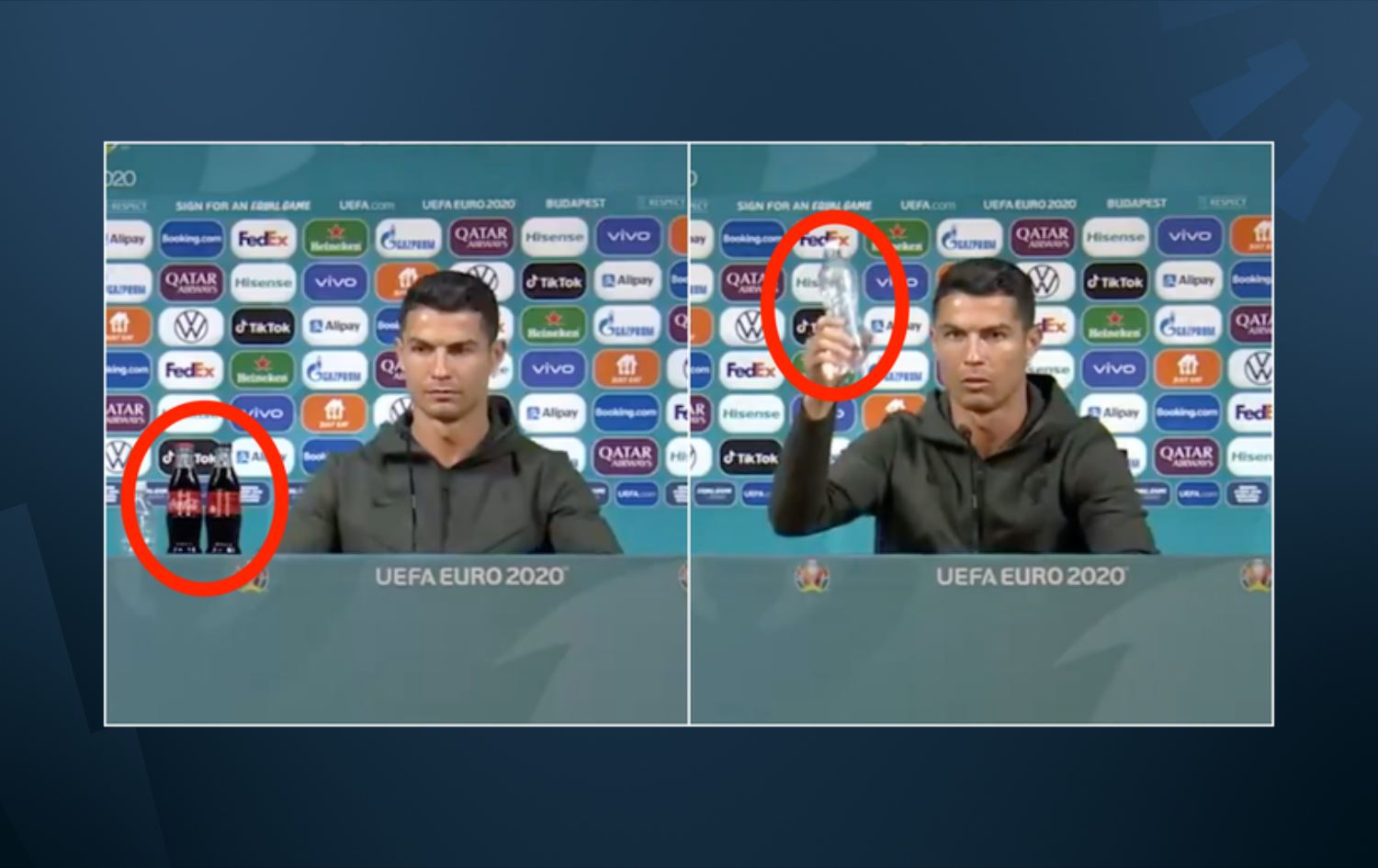 Ronaldo, Avrupa Şampiyonası'ndaki basın toplantılarında ürün yerleştirme yöntemiyle masalarda bulundurulan Coca-Cola şişelerinin yanında konuşmayı reddetti. Juventus'un yıldızı Coca-Cola şişelerini kaldırırken, elindeki suyu göstererek "Bu size yeter" dedi.