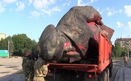 Zaparojya kentinde Sovyet Sosyalist Cumhuriyetler Birliği’nin (SSCB) en önemli sembollerinden Lenin heykelini sökmek için başlayan çalışmalar ikinci gün sona erdi.
