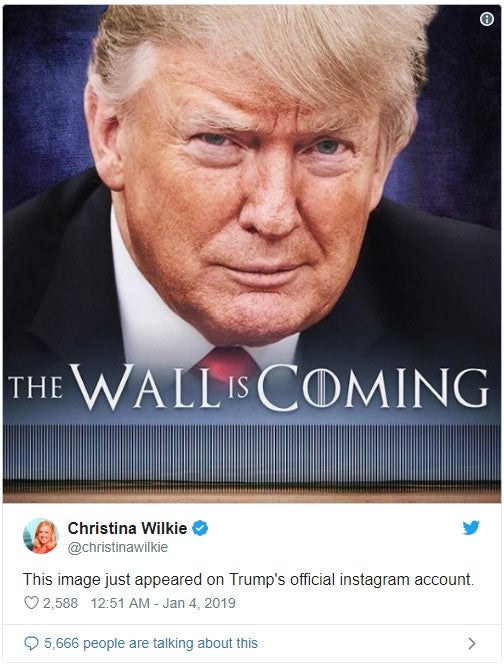 Trump daha önce de Game of Thrones dizisinde, kuzeyli Stark ailesinin mottosu olan ‘Winter is coming’ (Kış geliyor) ifadesine atıfta bulunarak,"Sanctions are coming" (Yaptırımlar geliyor) yazılı bir afiş yayınlamıştı. Trump aynı şekilde Meksika Duvarı için de bu repliği kullanarak ‘Duvar geliyor’ diye yazmıştı.