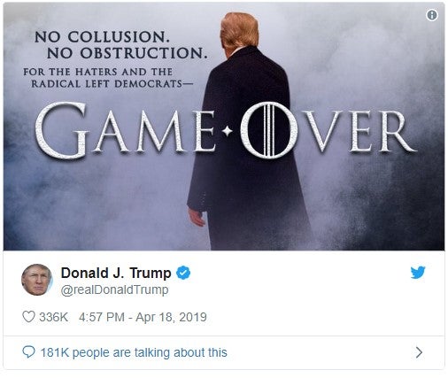 Bu açıklama üzerine Trump, Game of Thrones dizisine atıfta bulunarak, "Gizli işbirliği de adaleti engelleme de yok. (Benden) Nefret edenler ve radikal sol Demokratlar için OYUN BİTTİ” yazılı afiş yayınladı.