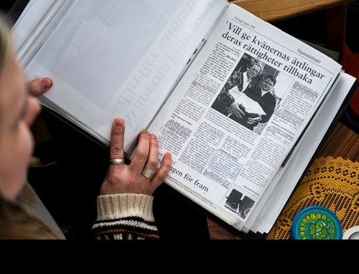 İsveçli Tornedalingar Federasyonu STR-T’de görevli olan Eva Kvist, 1999’dan kalma gri renkli bir sayfa gösteriyor. Bu sayfanın, azınlığın yerli statüsü için yaptığı ilk talebi içeren bir gazete kupürü olduğunu belirtiyor.
