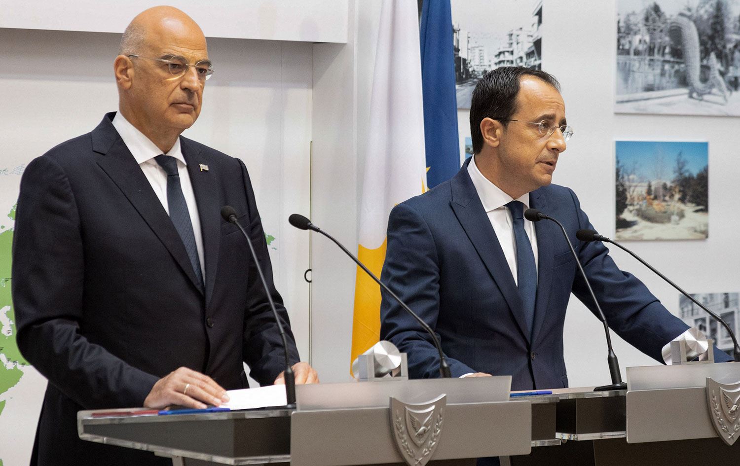 Kıbrıs Cumhuriyeti Dışişleri Bakanı Nikos Christodoulides (sağda) Yunan mevkidaşı Nikos Dendias ile başkent Lefkoşa'da ortak basın toplantısı düzenledi. Foto: AFP