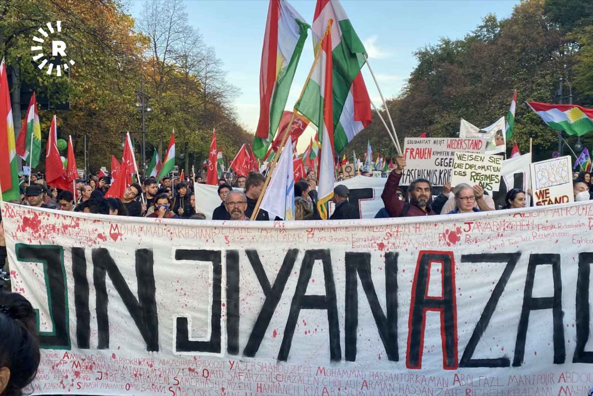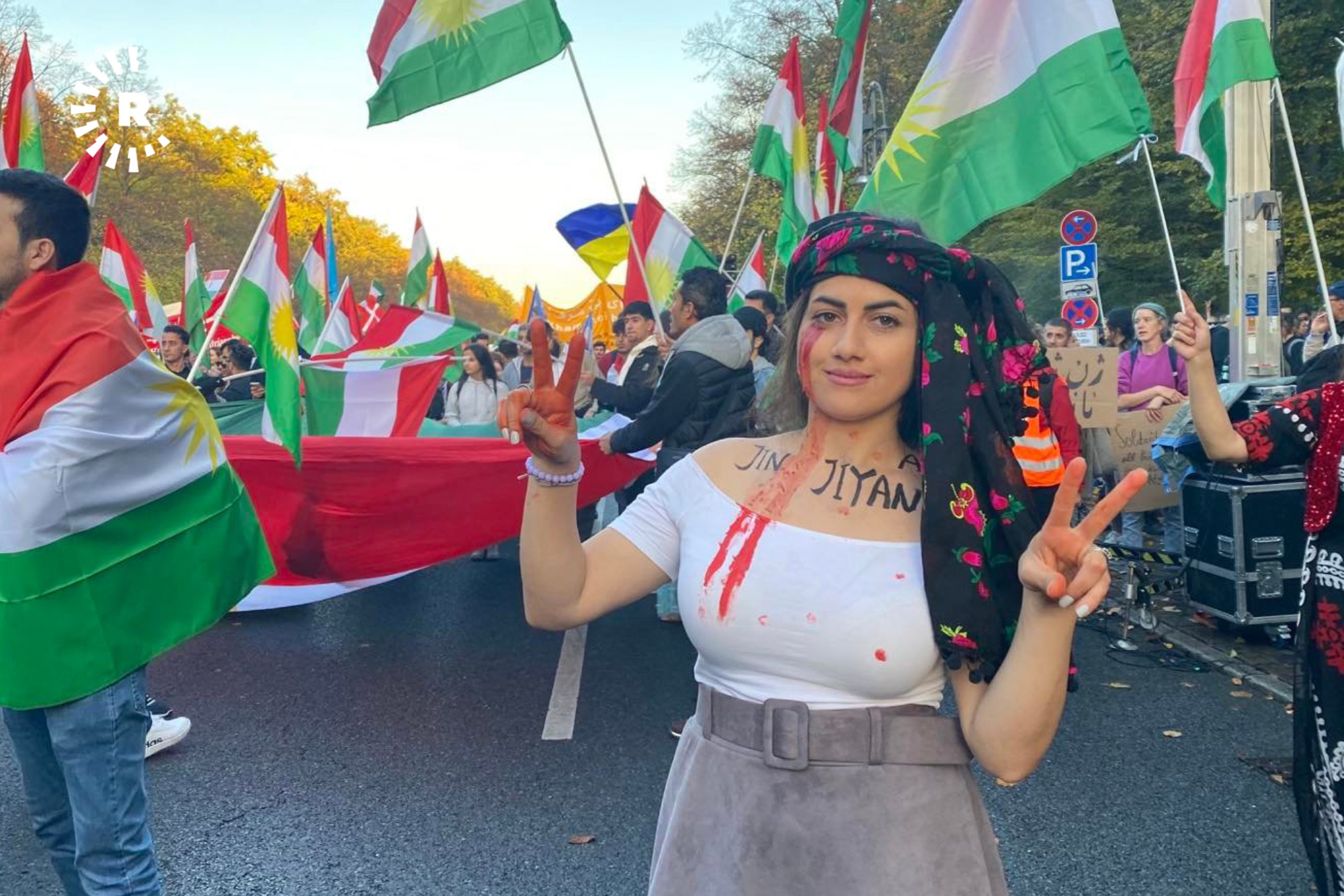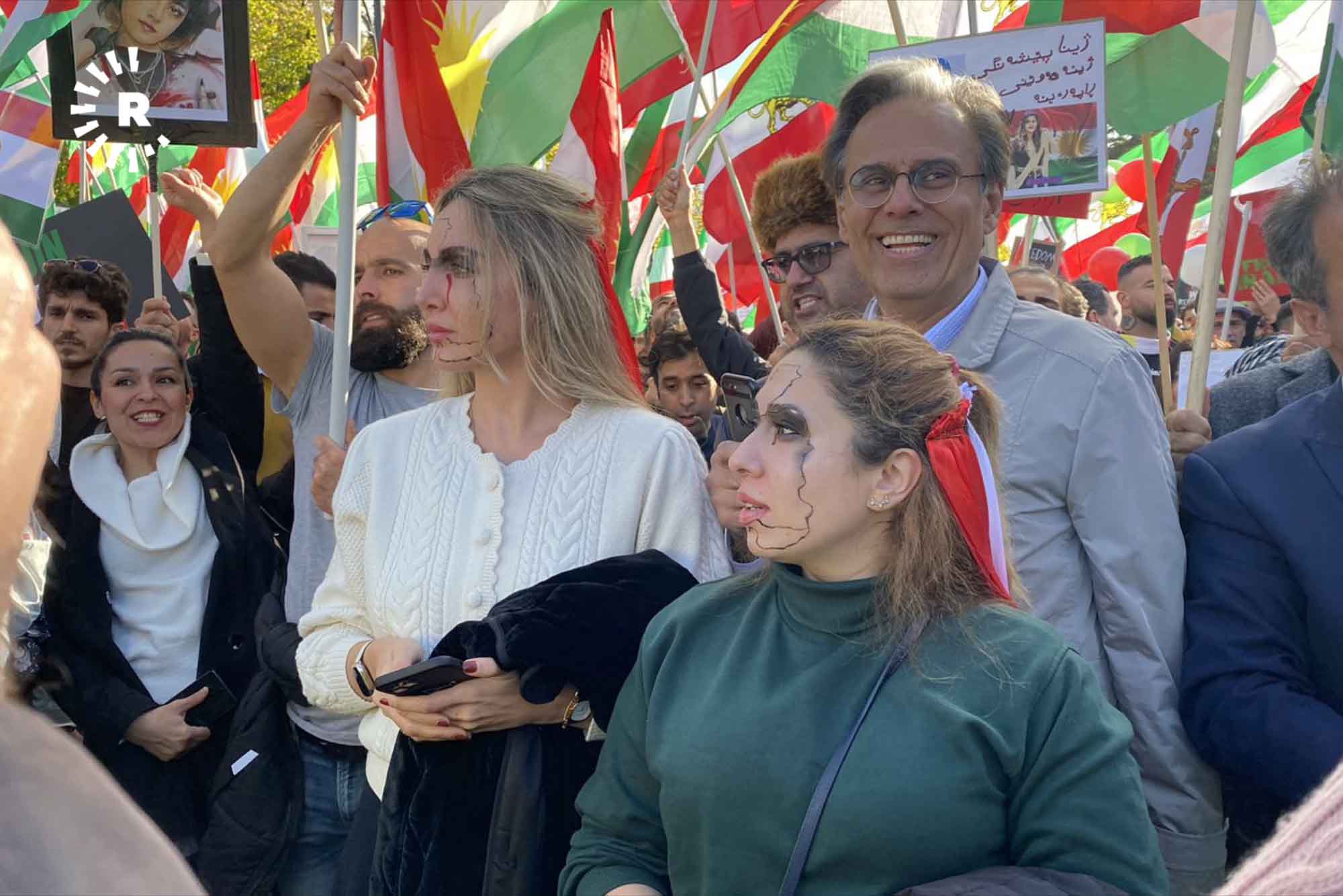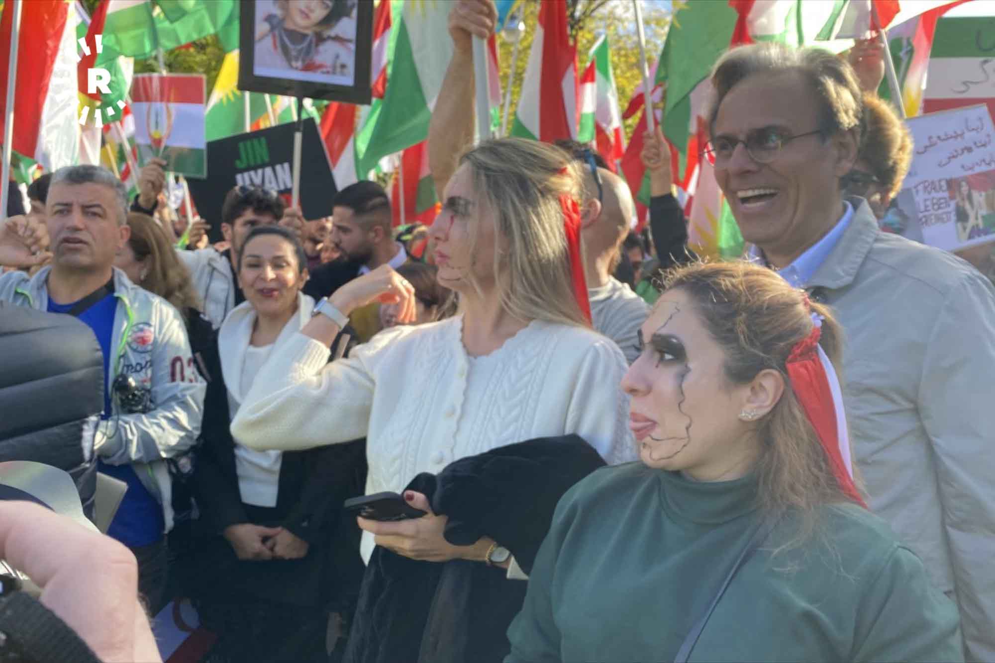 Bir grup Kürt gösterici Kürdistan Bayrağı açtı. “Jin, Jiyan, Azadî” sloganları attı ve İran ahlak polisi tarafından gözaltına alındıktan sonra yaşamını yitiren Kürt kadın Jina Emini ile gösterilerde yaşamını yitirenlerin fotoğrafları taşındı.