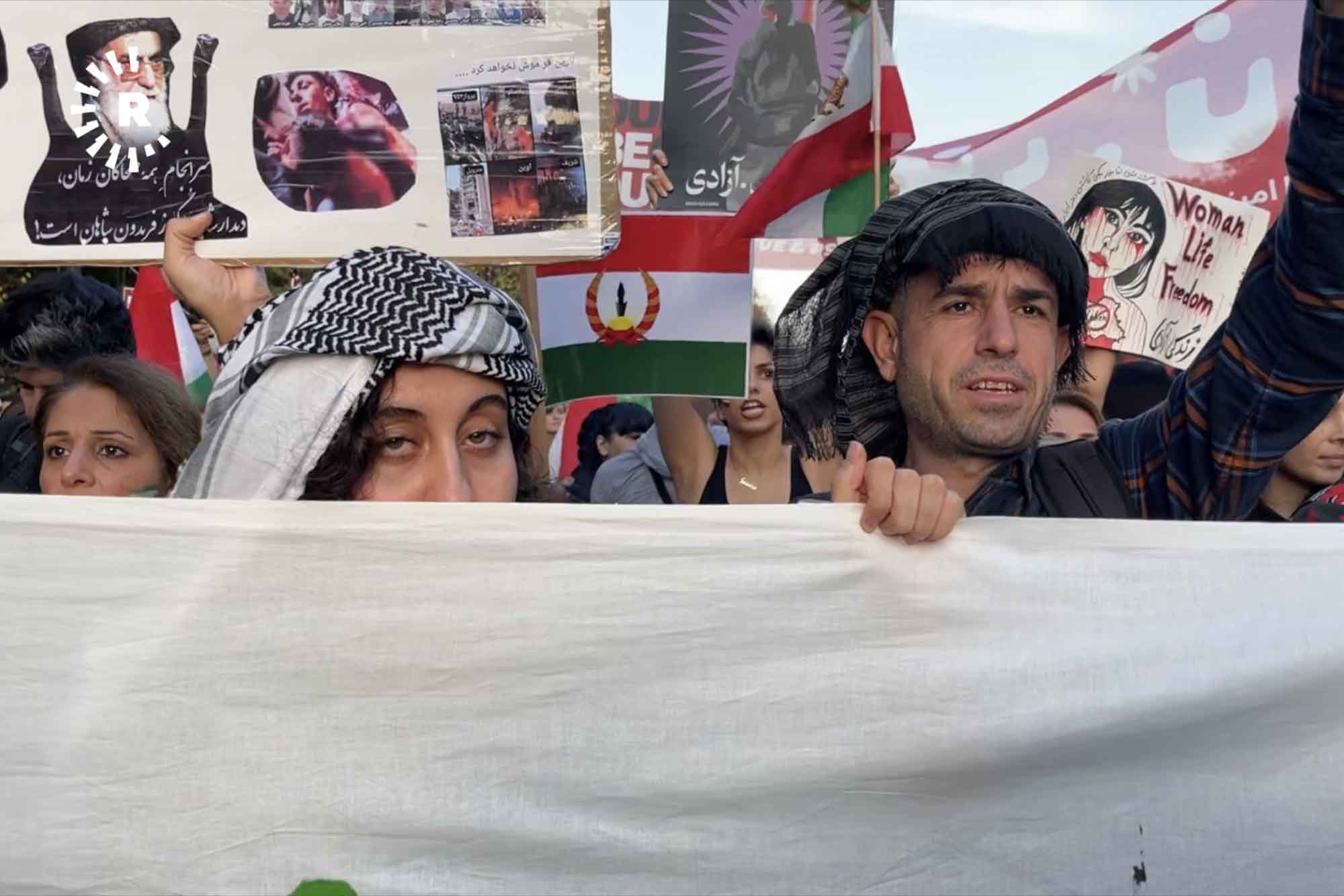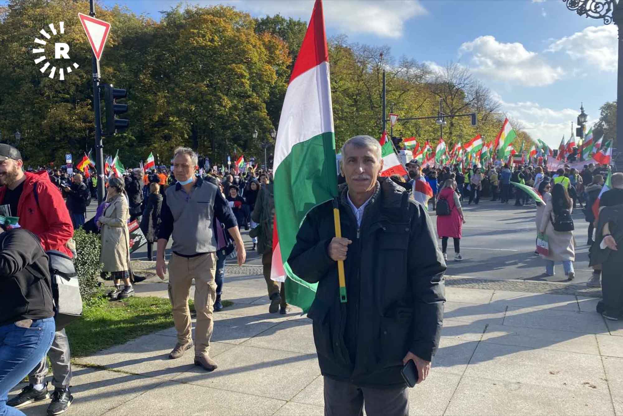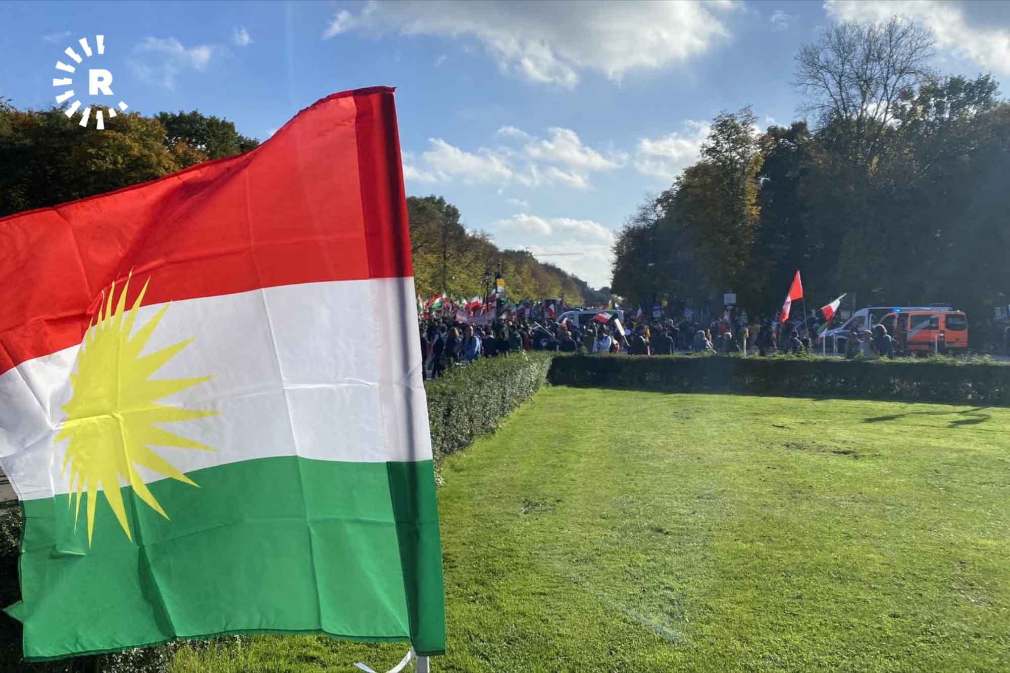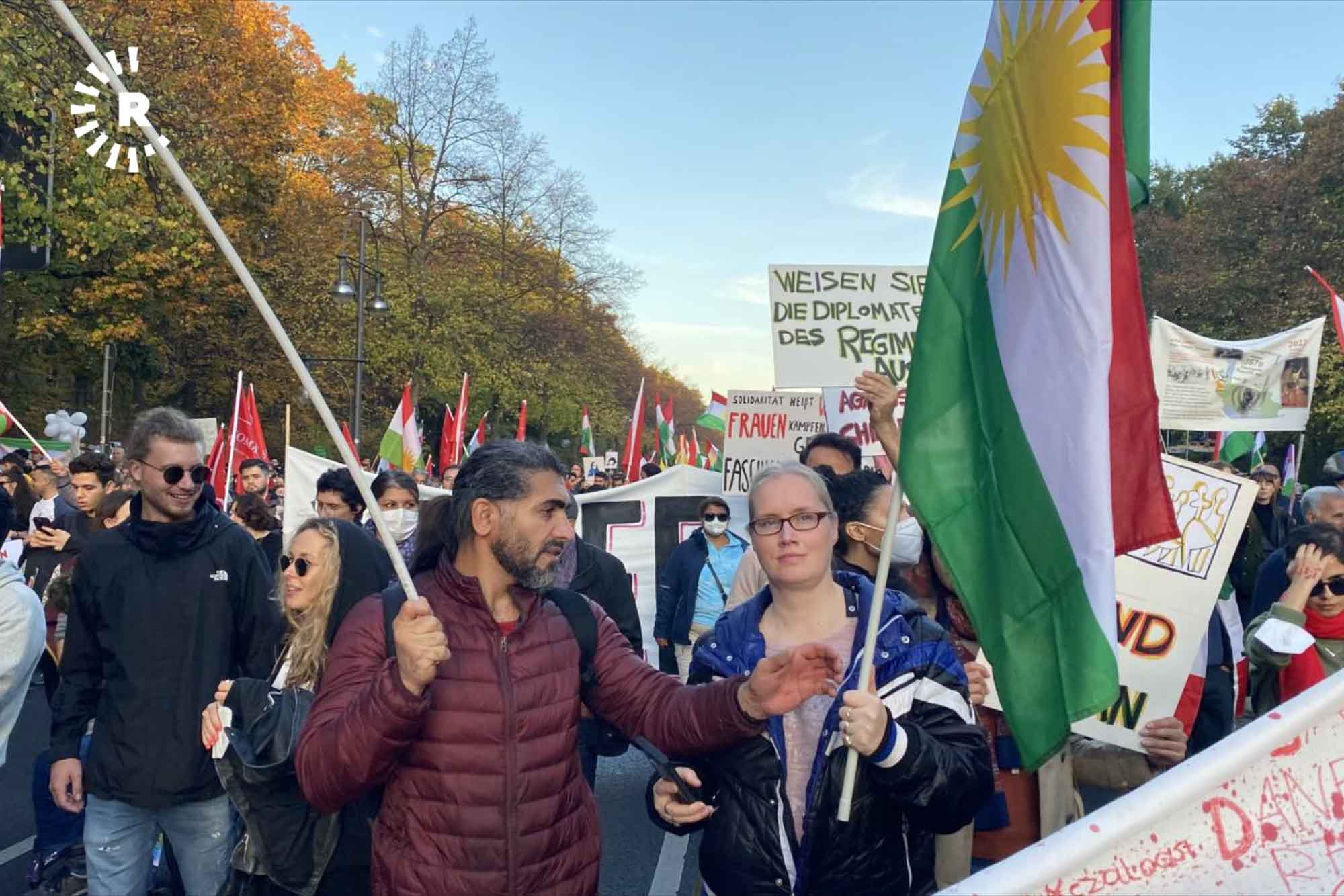 Bir grup Kürt gösterici Kürdistan Bayrağı açtı. “Jin, Jiyan, Azadî” sloganları attı ve İran ahlak polisi tarafından gözaltına alındıktan sonra yaşamını yitiren Kürt kadın Jina Emini ile gösterilerde yaşamını yitirenlerin fotoğrafları taşındı.