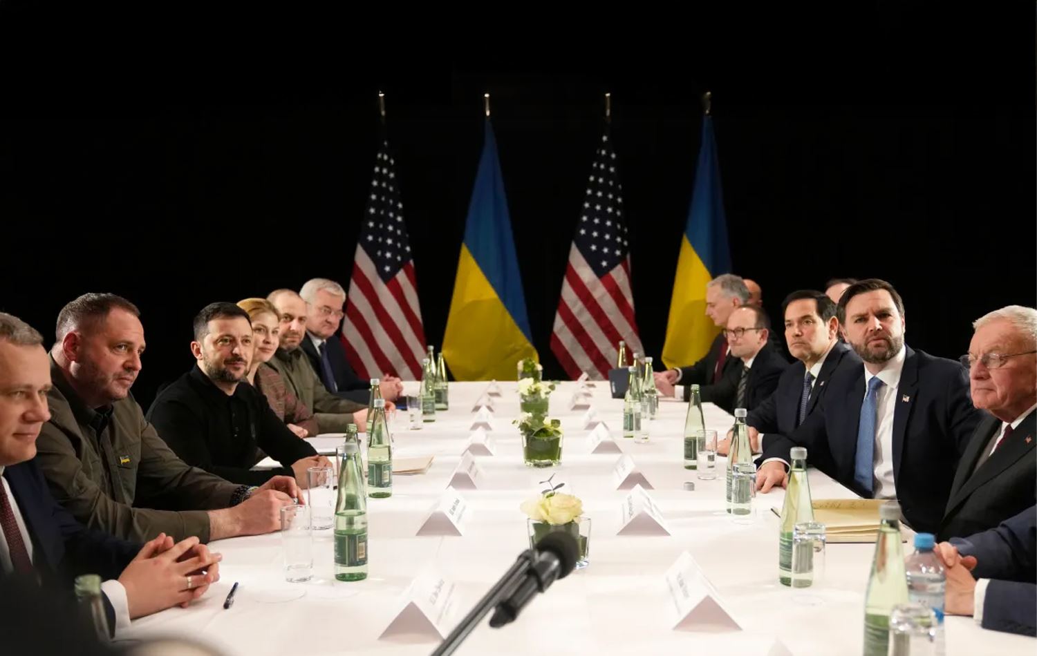 Foto: ABD Başkan Yardımcısı JD Vance (sağdan ikinci) ve ABD Dışişleri Bakanı Marco Rubio (sağdan üçüncü), 14 Şubat 2025 Cuma günü Almanya'nın Münih kentinde düzenlenen Münih Güvenlik Konferansı marjında, Ukrayna Devlet Başkanı Volodimir Zelenski (soldan üçüncü) ile ikili bir görüşme sırasında. AP